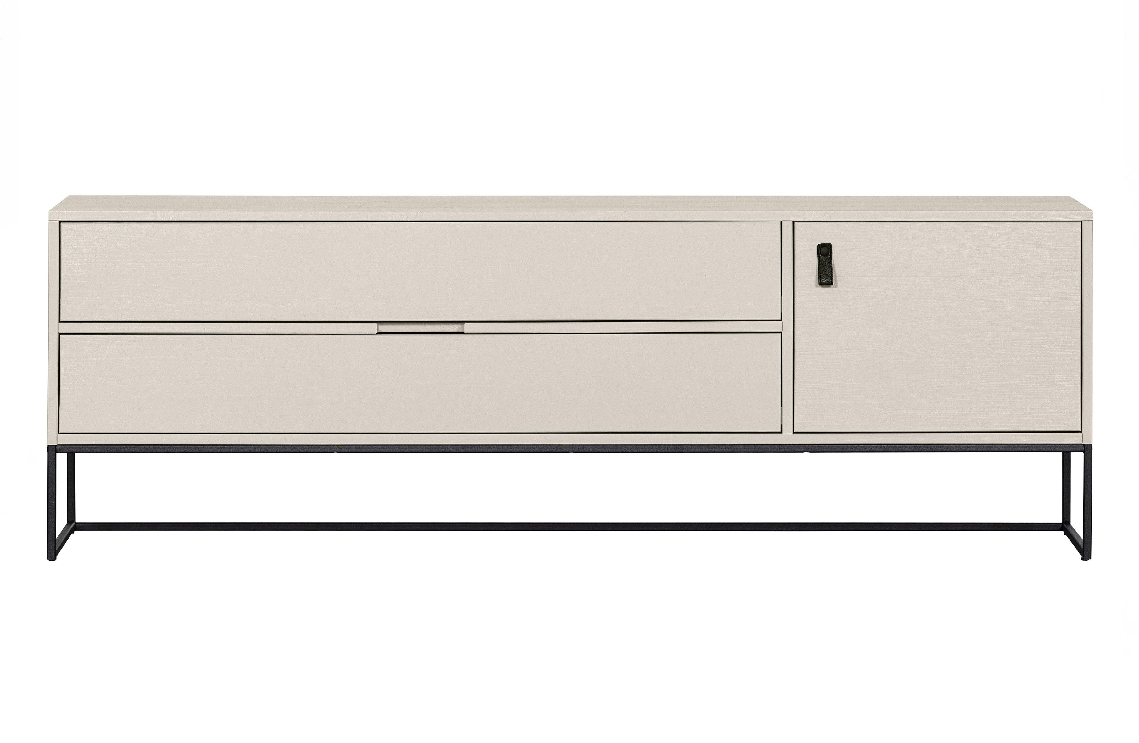 Design Schränke Silas garantiert die Funktionalität auf höchstem Niveau. Mit der breiten Oberfläche können Sie sich auf große Fernseher einrichten, und praktische Regale und Schubladen bieten Orte für alle erforderlichen RTV -Zubehör - von Piloten über Konsolen bis hin zu Sammlungen von Filmen und Spielen.