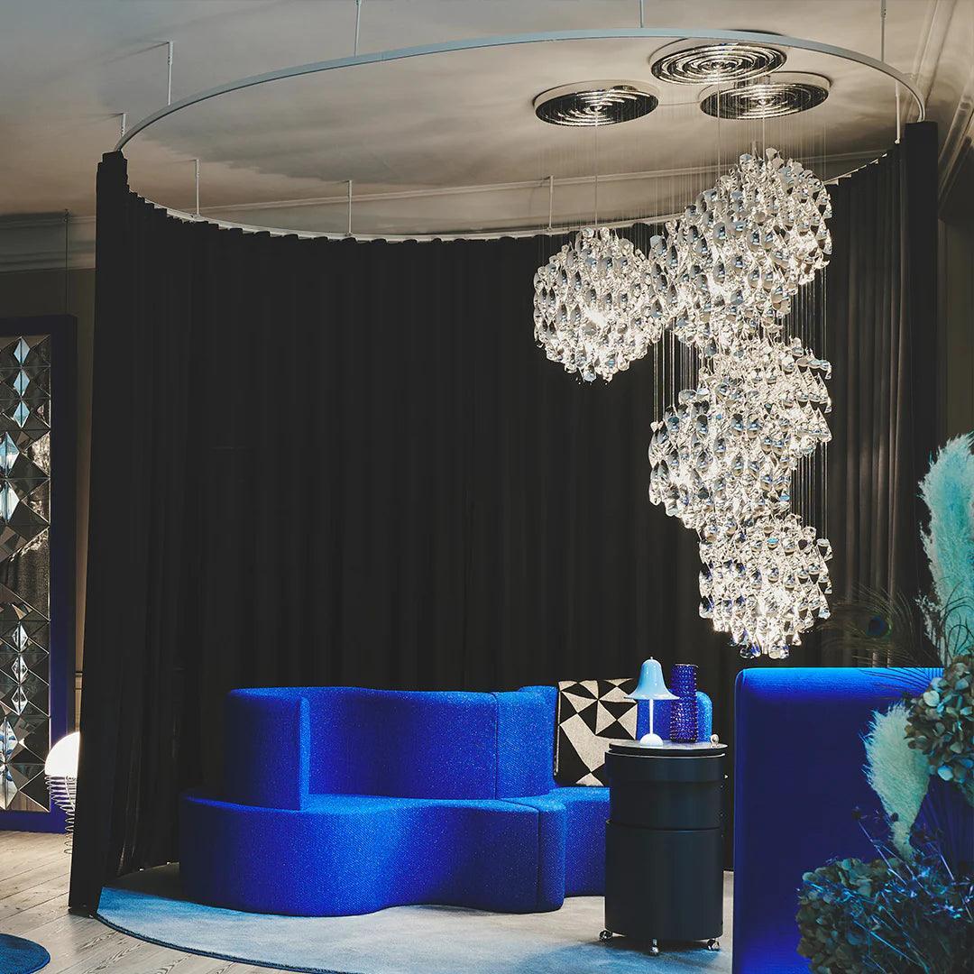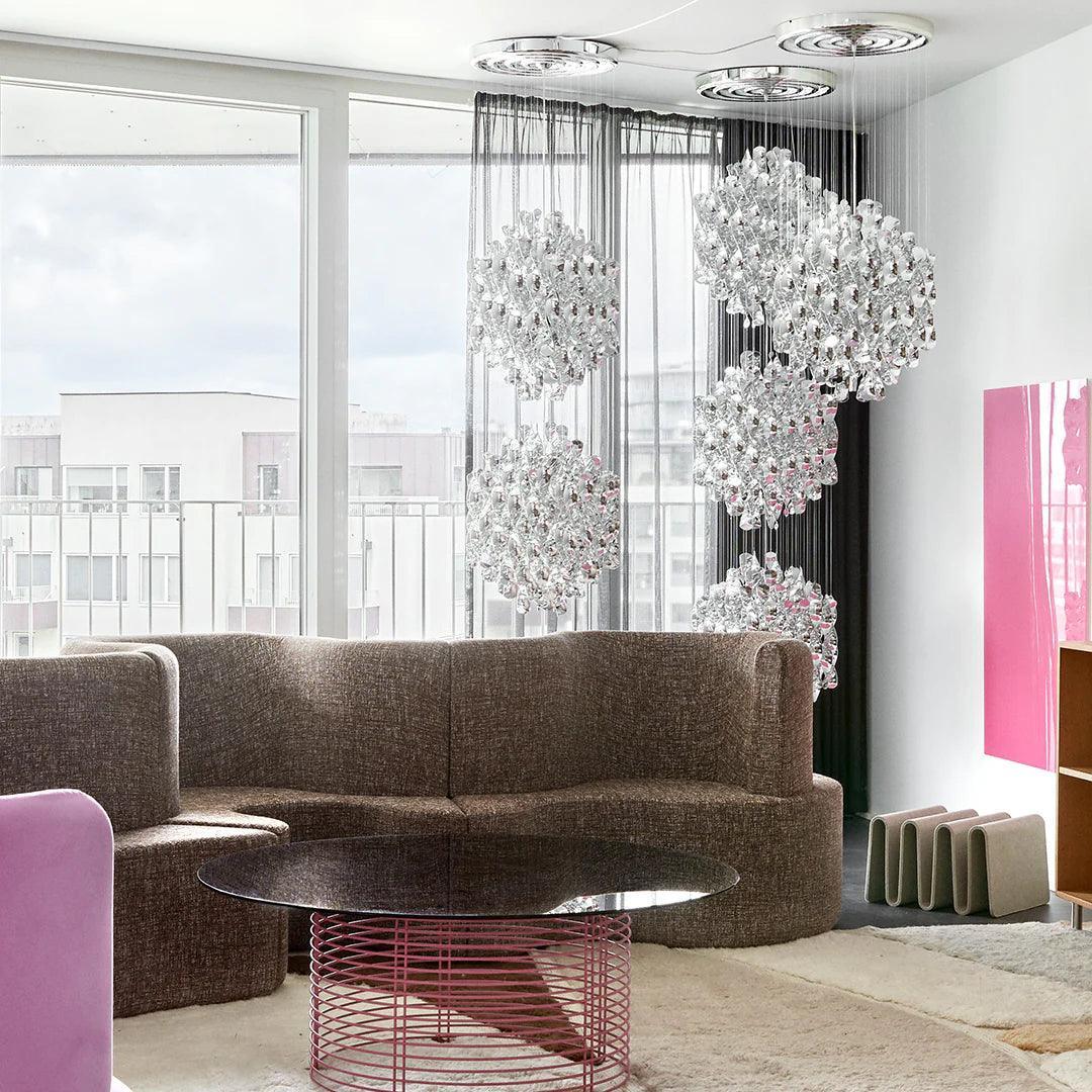 Die Lampe Spiral kann in verschiedenen Räumen platziert werden, wie im Wohnzimmer, Esszimmer oder Schlafzimmer, wo sie sowohl als Haupt- als auch als dekorative Beleuchtung fungieren kann. Sie wird zweifellos ein herausragendes Element der Einrichtung sein, das mit ihrem einzigartigen Stil Aufmerksamkeit erregt und eine Aura künstlerischer Extravaganz in den Raum bringt.