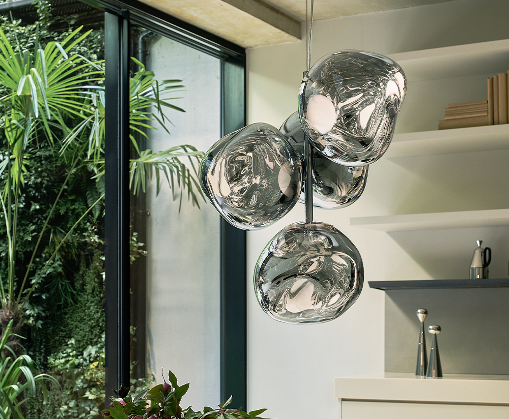 Der Melt ist eine dynamische Lichtskulptur, die aus sieben organischen, unregelmäßigen Kugeln besteht, die von einem zentralen Punkt aus strahlen und einen Effekt unendlicher Reflexionen erzeugen. Dieser moderne Kronleuchter bietet einen frischen Blick auf klassische Deckenbeleuchtung und verbindet die Ästhetik von geschmolzenem Glas mit innovativer Technologie.