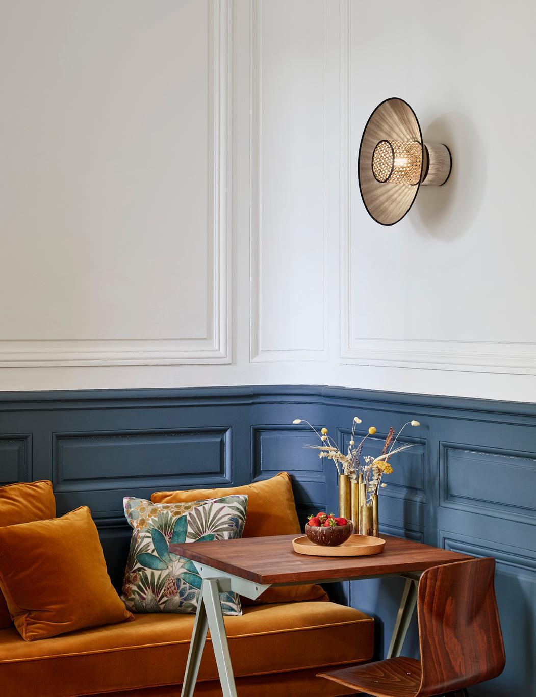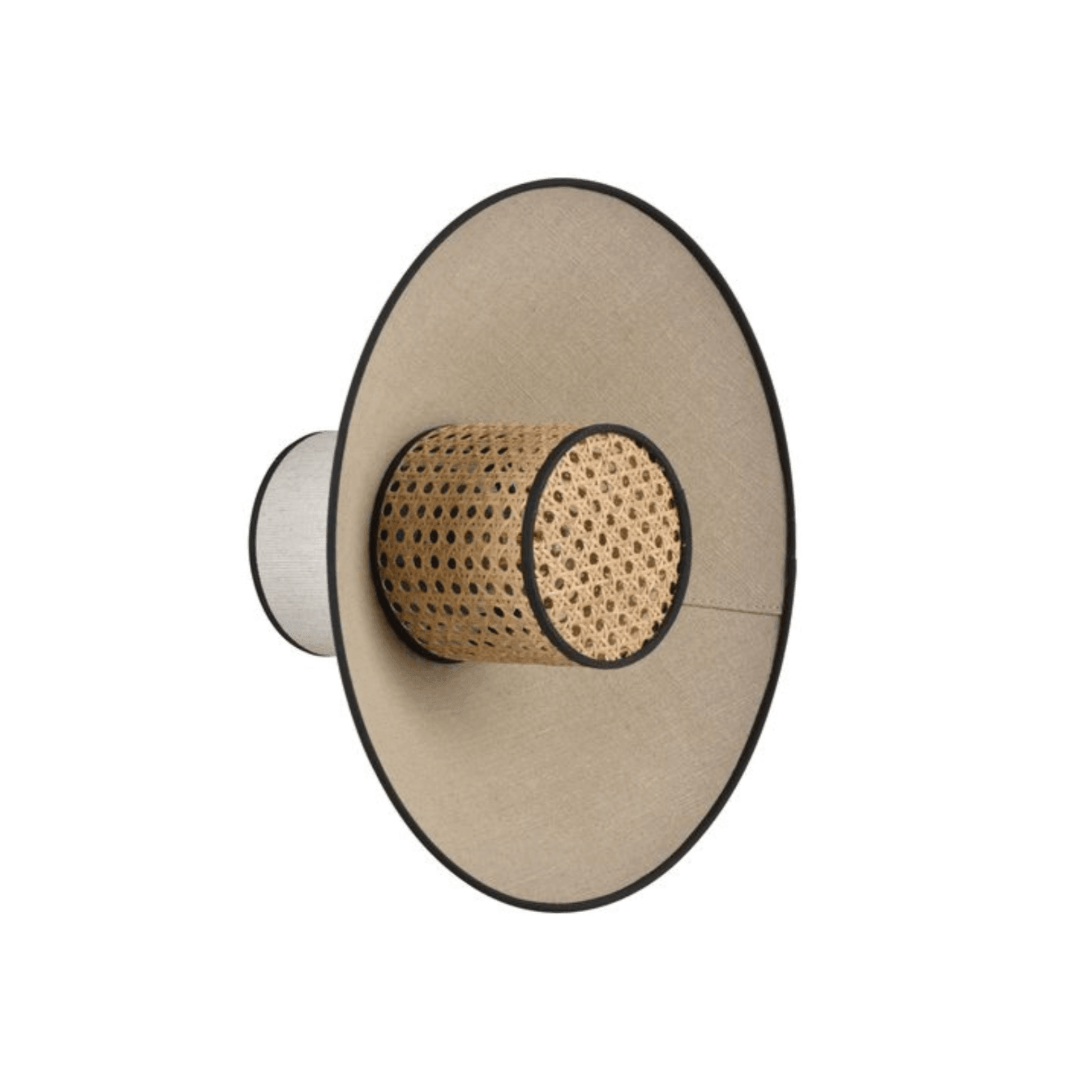 Wandlampe Singapour in einem Beige -Schatten ist eine konische Struktur mit Lampenschirmen aus Flachs und Wicker. Es verfügt über eine runde Basis aus bemalten Metall, die an das DCL -System adaptiert ist und eine einfache Beleuchtungsanpassung ermöglicht.