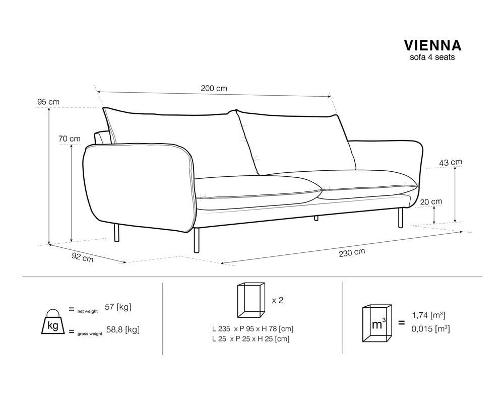 Sofę Vienna wyróżniają piękne proporcje i harmonijne kształty. Sofa do salonu jest nie tylko wygodna, ale też wprowadzi do wnętrza nutę paryskiego szyku i elegancji. Subtelny kształt i miękkie siedzisko zapewnią niezwykły komfort użytkowania. Metalowe nogi nadają całej formie lekkości.