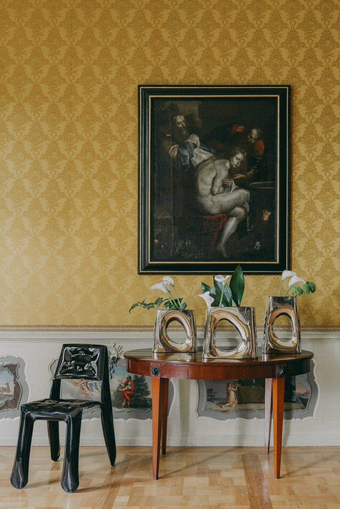 Die Entdeckung des Stuhls ist wie eine köstliche Berührung mit der Magie. Es ist die Verbindung von frostiger Stahlkraft mit der Weichheit künstlerischer Verformung. Es ist ein einzigartiges Werk, das sich aus den Schablonen löst und zum Ausdruck von Einzigartigkeit wird. Der Stuhl führt uns an die Grenze zwischen Realität und Fantasie, wo Kälte und Wärme, Rauheit und Zartheit zu einem unvergesslichen Bild verschmelzen.
