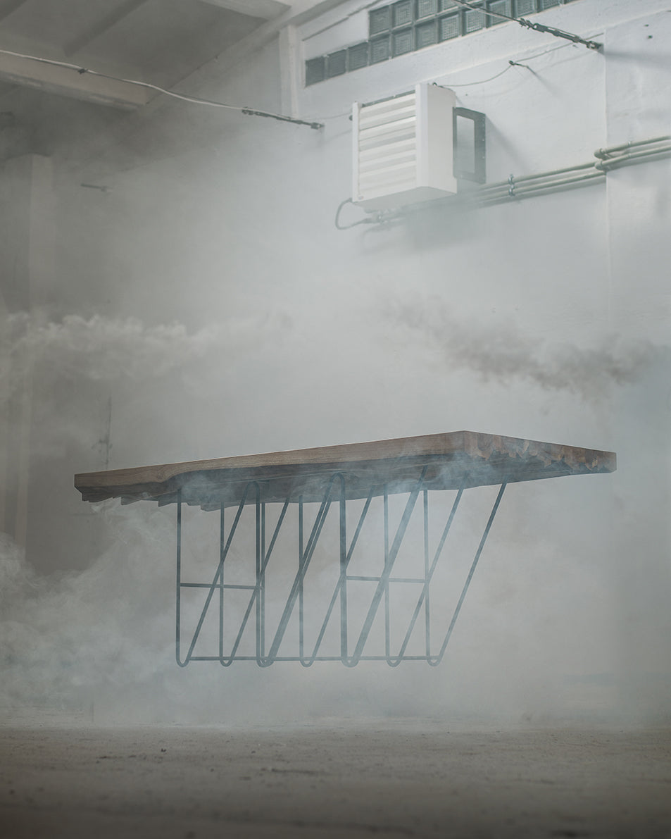 Bei der Herstellung der Tischplatte aus unbehauenen Balken entsteht jedes Mal eine einzigartige Komposition von Formen und Holznuancen. Das Ergebnis ist eine solide und stabile Oberfläche, die auf einer leichten, stählernen Konstruktion mit geschwungener Linie ruht. Durch diesen Kontrast vereint der Holztisch Masiv die Monumentalität der massiven Eiche mit der subtilen Modernität des Metallgestells. Es ist ein Tisch aus massiver Eiche, der sowohl in modernen als auch in klassischen Arrangements begeistert.