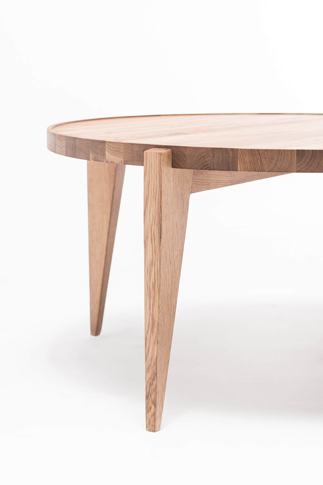 Der Holztisch Bontri ist ein Vorschlag, der entschlossenes Design mit hoher Verarbeitungsqualität verbindet. Seine charakteristische Form basiert auf leicht abgeschrägten Beinen und einer massiven Tischplatte mit deutlich geschliffenen Kanten. Details wie die Vertiefung oder die dynamische Linie der Beine verleihen ihm einen einzigartigen Charakter und machen diesen runden Couchtisch sowohl funktional als auch dekorativ.