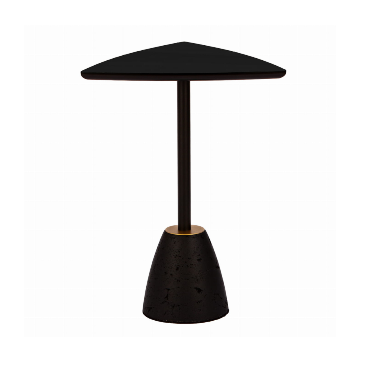 Eleganter Couchtisch Concri vereint modernes Design mit außergewöhnlicher Funktionalität. Die dreieckige Tischplatte mit abgerundeten Ecken, gefertigt aus Eichenfurnier in schwarzer Ausführung, verleiht dem Raum subtile Eleganz und raffinierten Stil. Das Ganze wird von einem schlanken, pulverbeschichteten Metallfuß in Schwarz getragen, während die stabile Betonbasis mit goldenen Akzenten an der Verbindung dem Möbelstück einen luxuriösen Charakter verleiht.