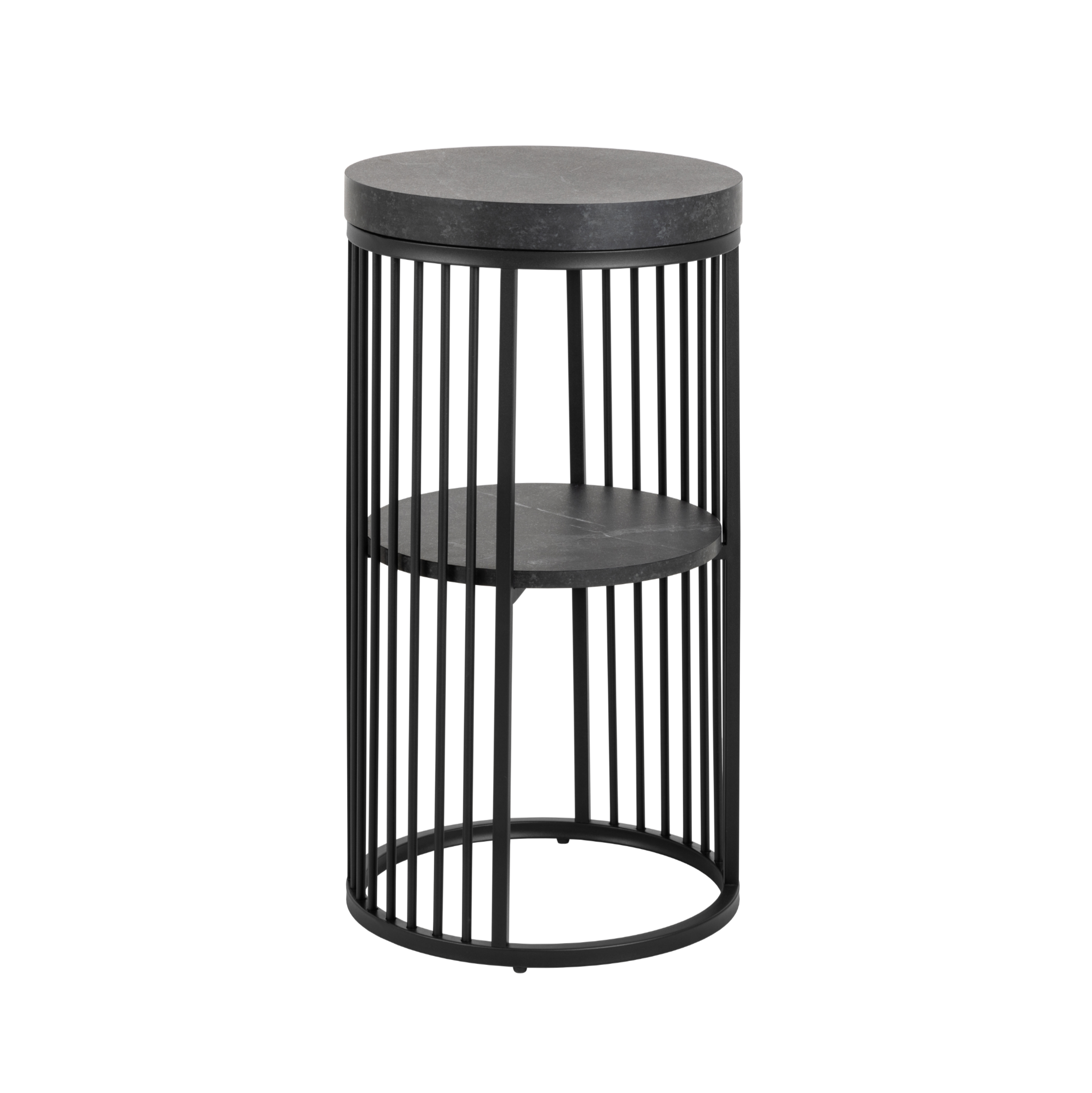 Materiały: Blat i półka z płyty melaminowanej w czarnym, matowym wykończeniu Izmir; podstawa z metalu malowanego proszkowo na czarno