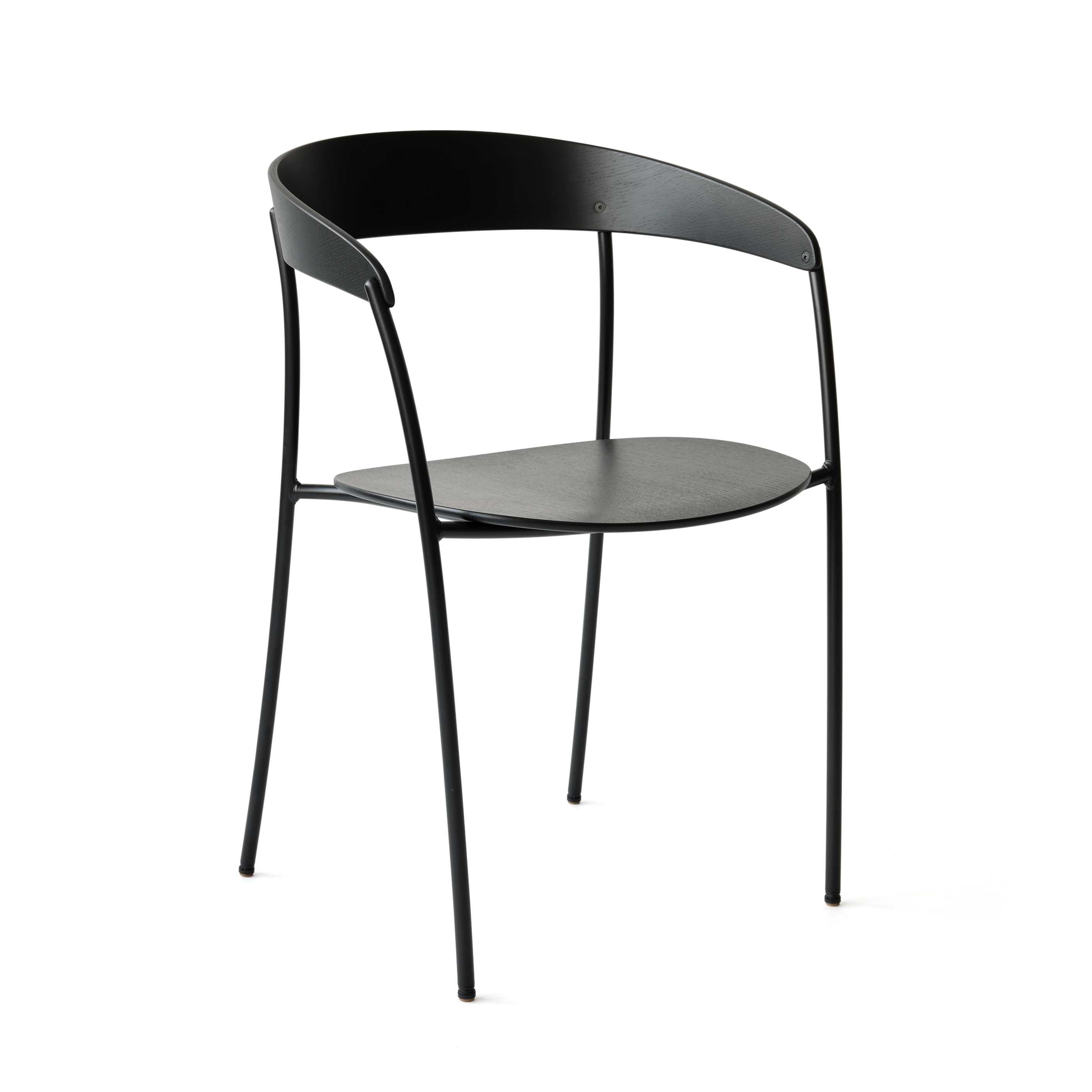 Der Stuhl mit Armlehnen Missing ist die Essenz minimalistischen Designs und moderner Funktionalität. Sein schlanker, stählerner Rahmen verleiht ihm visuelle Leichtigkeit, während die sanft abgerundete Sitzfläche und Rückenlehne ergonomischen Komfort bieten.