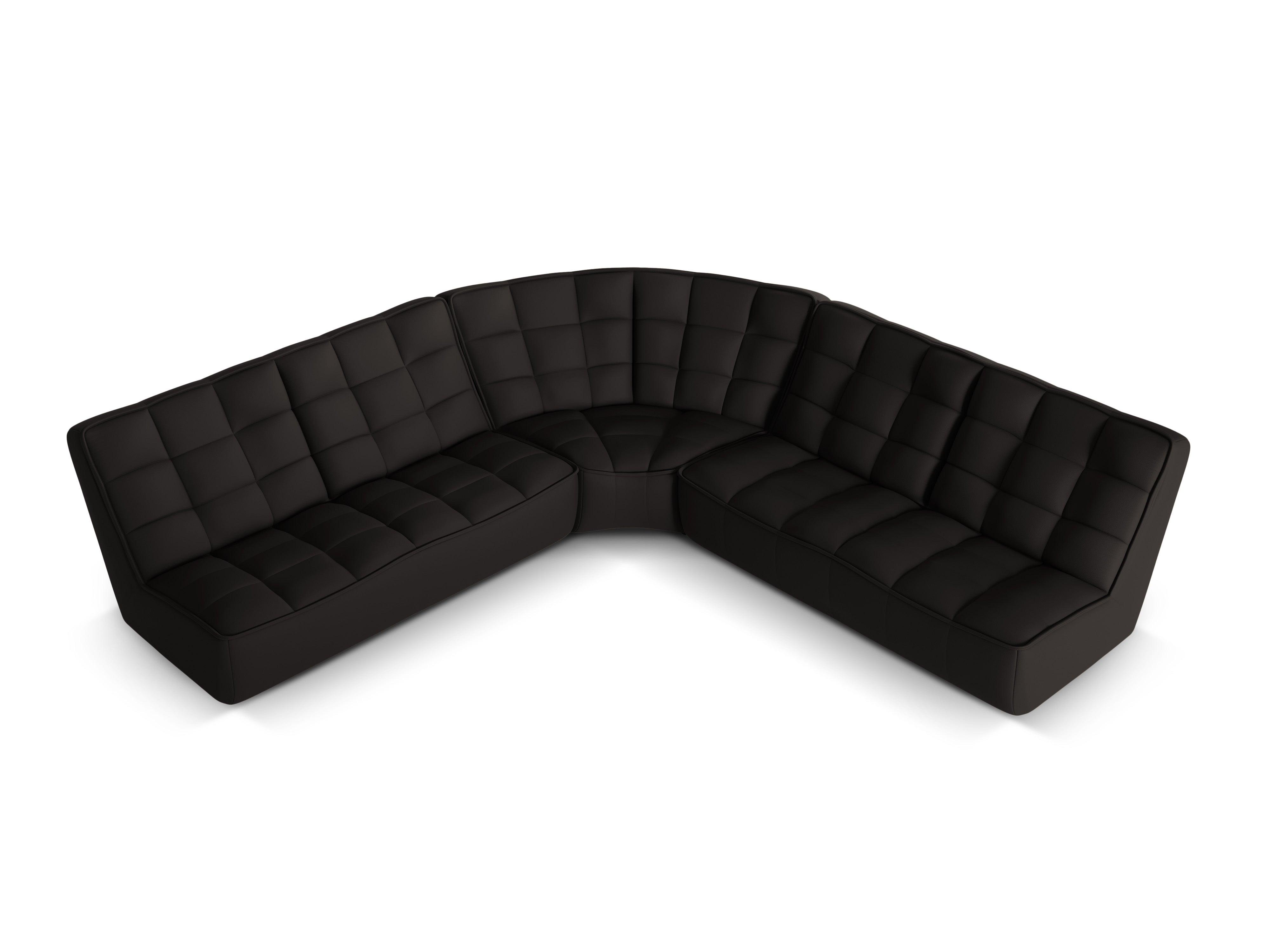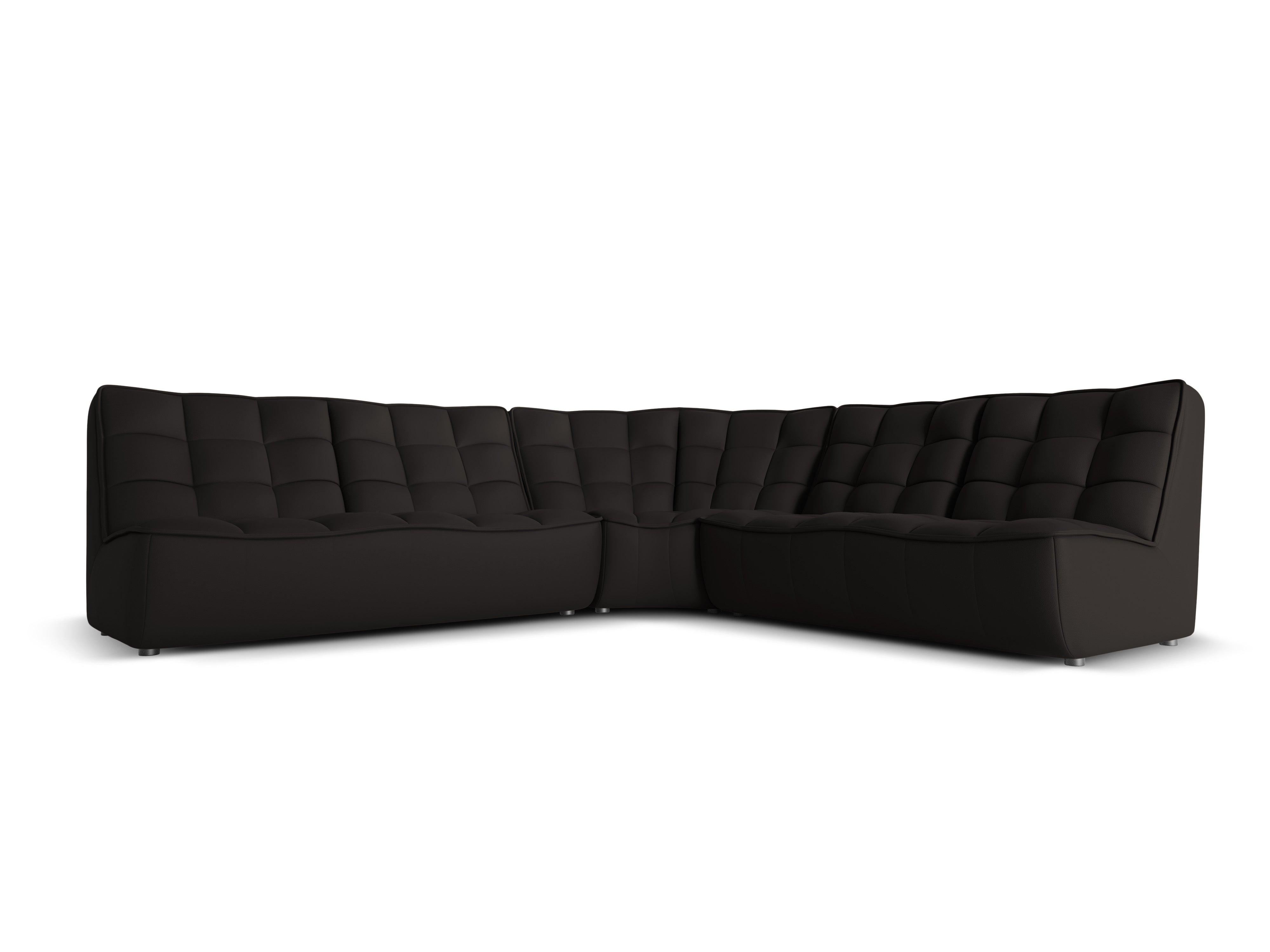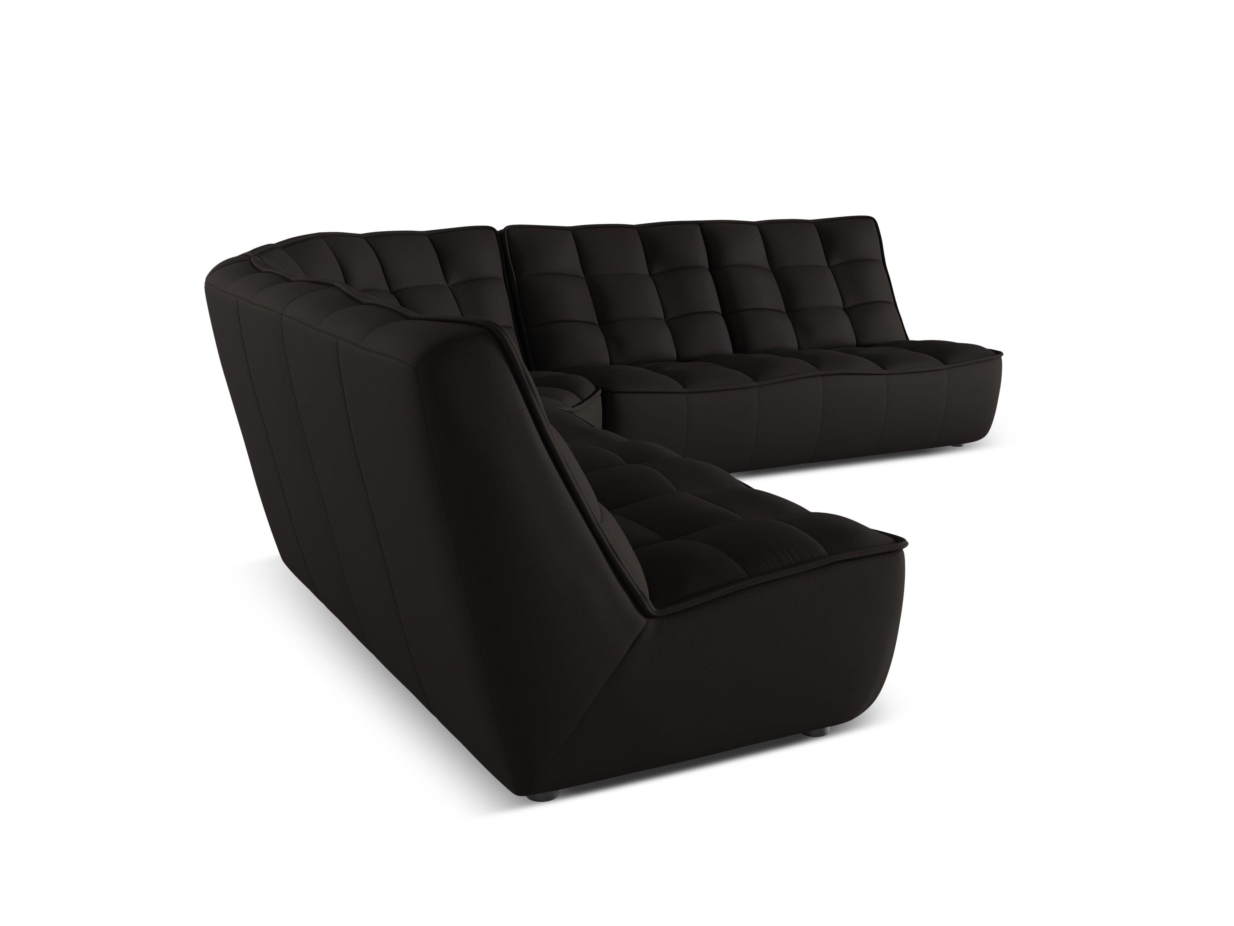 Leder-Ecksofa für sechs Personen Moni definiert Funktionalität und Komfort in Kombination mit modernem Design. Stilvolles Steppdesign und die originelle Form eignen sich sowohl für ein elegantes Wohnzimmer als auch für ein modernes Büro. Die Linie der Sitzfläche und der Rückenlehne ist gebogen und verfügt über eine sanft geformte Vertiefung, die außergewöhnlichen Komfort bietet.