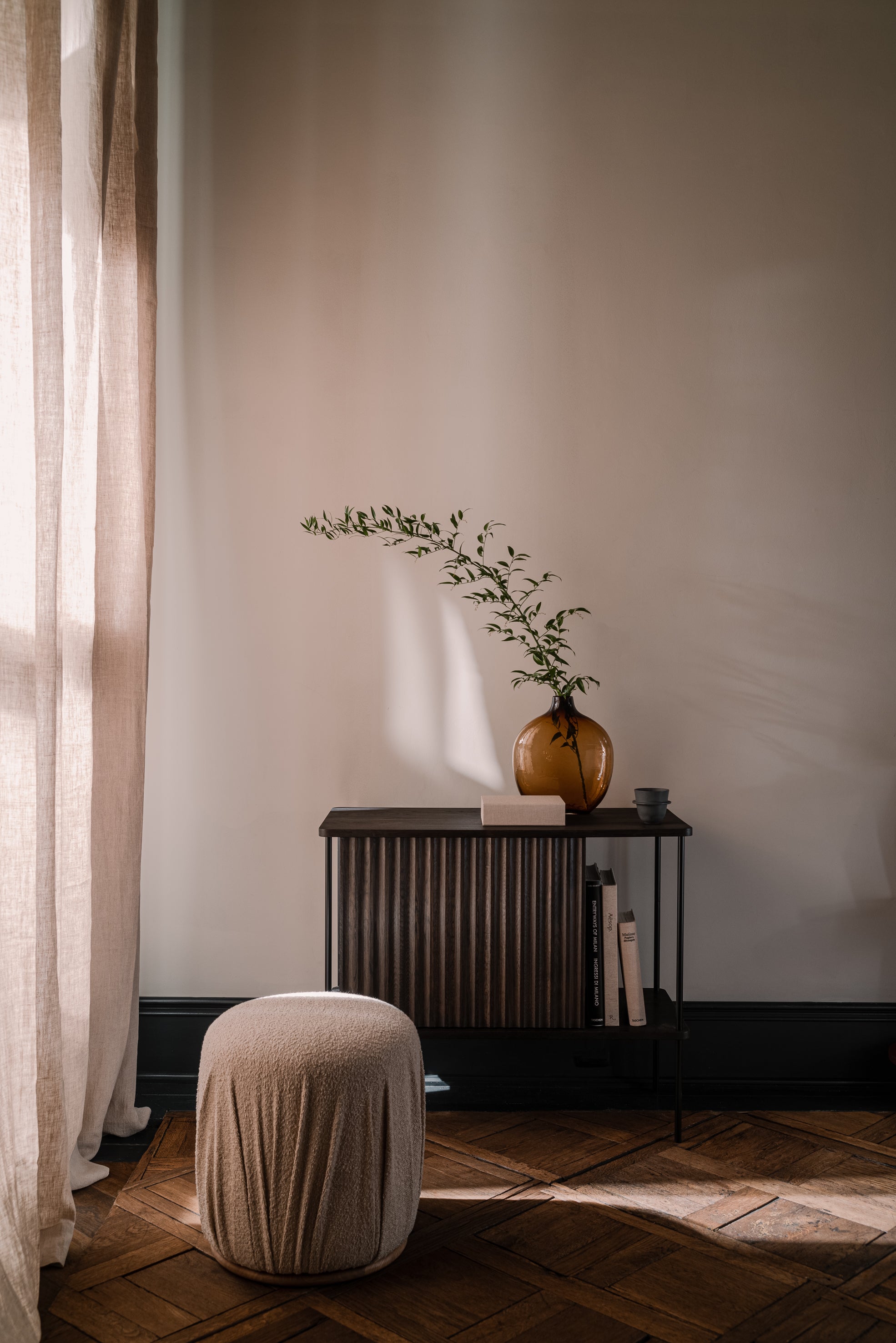 Der Schrank Maya ist ein ausdrucksstück Möbel, das skulpturale Form mit funktionalem Ansatz zur Aufbewahrung verbindet. Die charakteristische, gerillte Front mit wellenförmigem Muster zieht die Blicke an und verleiht dem Raum einen einzigartigen Rhythmus, während der Kontrast zwischen der Wärme des Massivholzes und dem kühlen Stahl dem Gesamtbild einen besonderen Ausdruck verleiht. Das seitliche Regal wurde mit Blick auf Musikliebhaber entworfen – es bietet perfekten Platz für einen Plattenspieler und eine Sammlung von Schallplatten und schafft so eine ästhetische und praktische Audiozone.