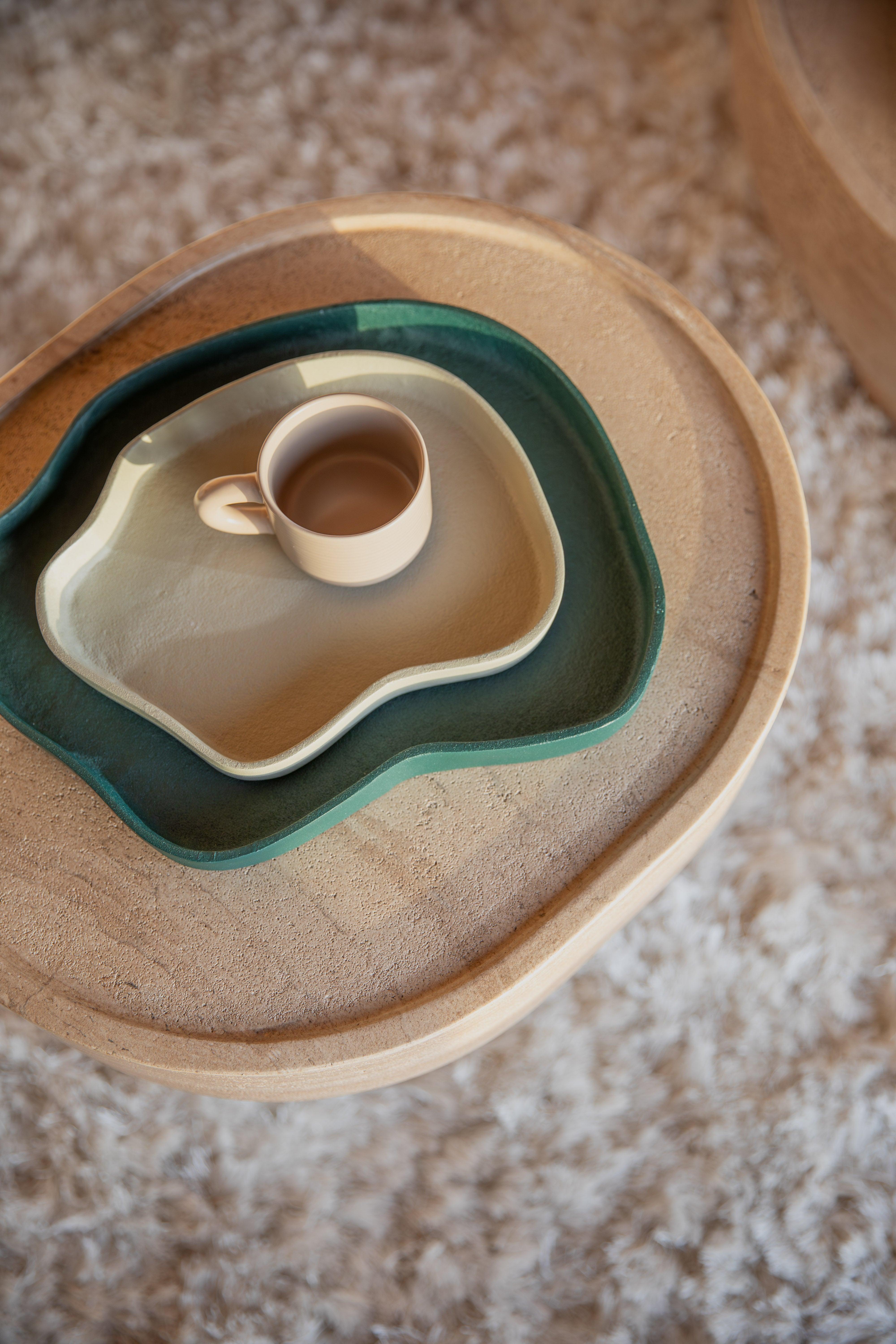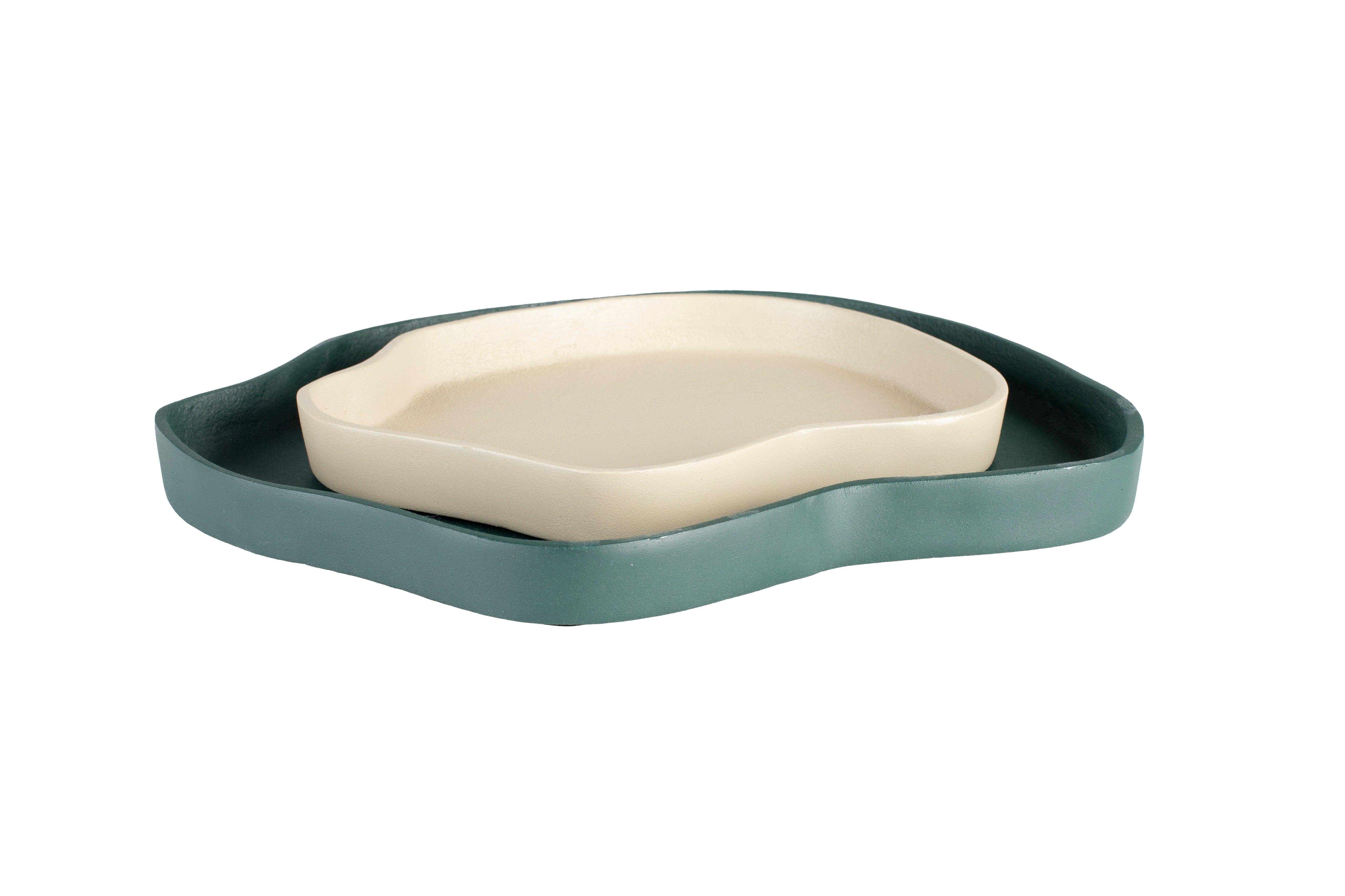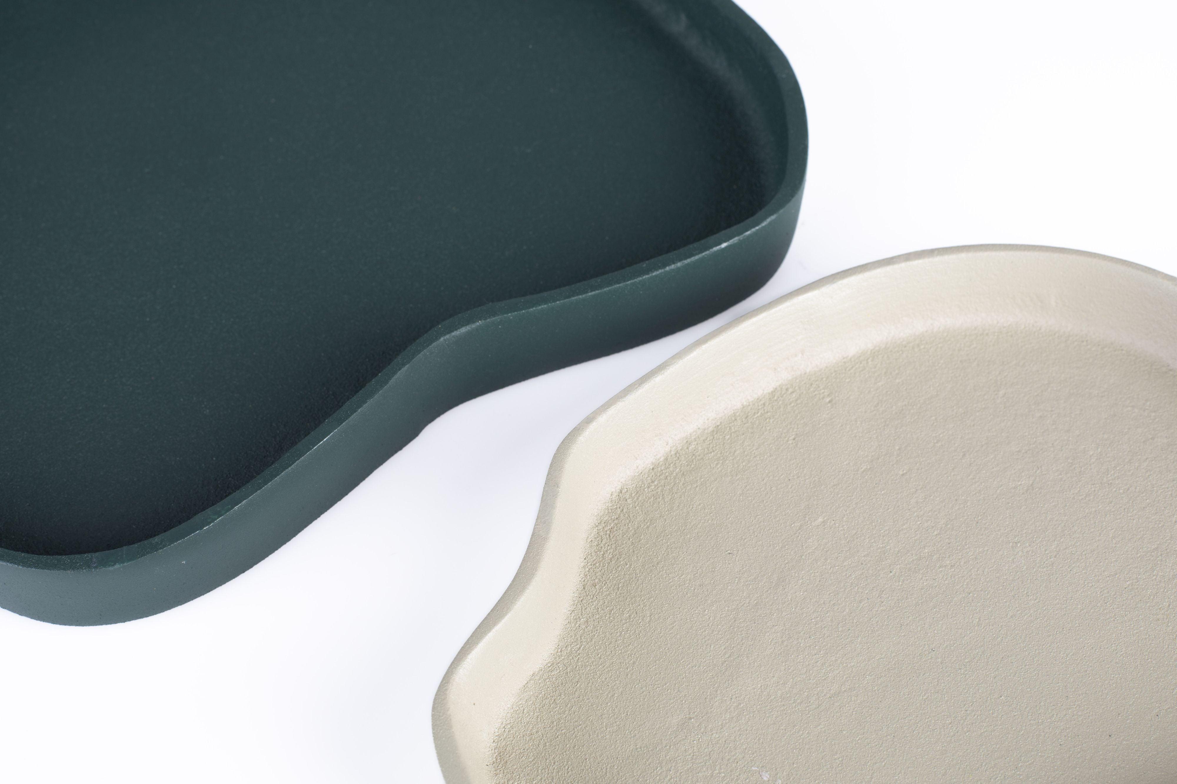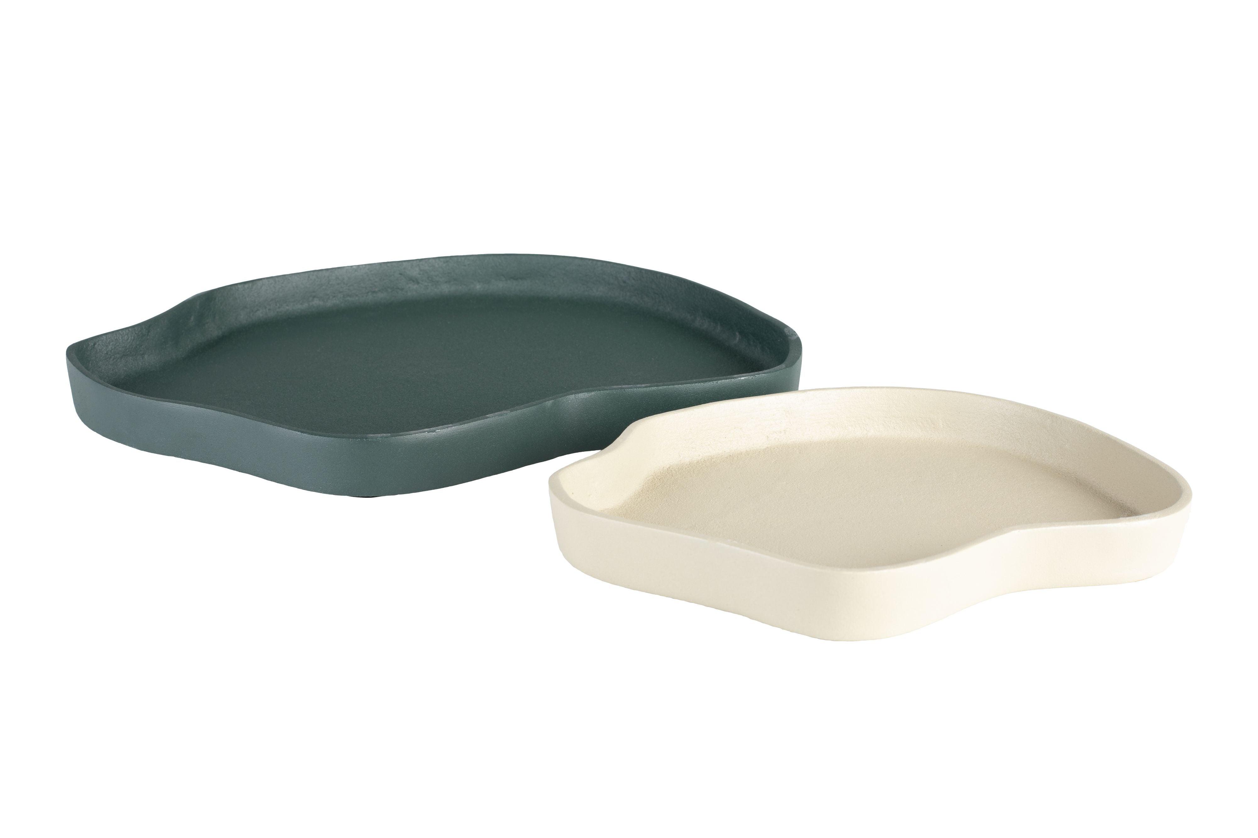 Set von Tabletts Revolt besteht aus zwei Stück in verschiedenen Größen. Ein Tablett ist in einem eleganten Grünton, das andere in einem subtilen Beigeton. Die Tabletts sind aus gebürstetem Aluminium gefertigt und mit einer Pulverbeschichtung versehen, die ihnen ein mattes Finish verleiht. Erhältlich in verschiedenen Farbsets, die sich leicht an Ihr Interieur anpassen lassen.