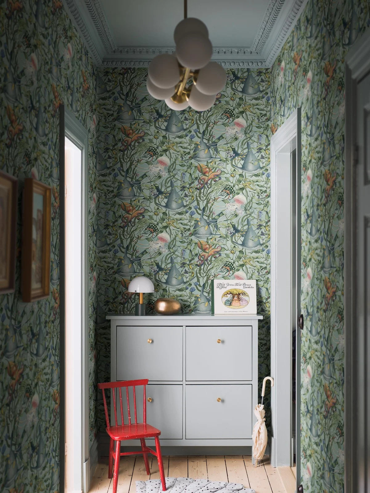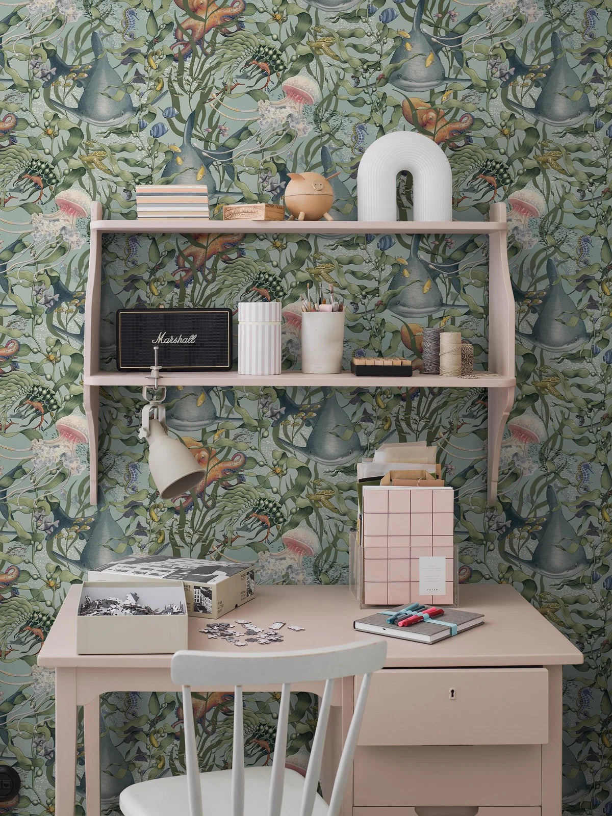 Tapete Underwater Magic entführt Sie in die ruhige und geheimnisvolle Welt der Unterwasserwelten und schafft eine beruhigende und fesselnde Atmosphäre. Das zarte Motiv der wogenden Algen enthüllt verborgene Meeresbewohner wie Seepferdchen und Riffhaie und regt die Fantasie und Neugier Ihres Kindes an. Tapete begeistert mit einem subtilen, von der Natur inspirierten Muster und ermöglicht es, einen harmonischen Raum zu schaffen, der zur Entspannung einlädt.