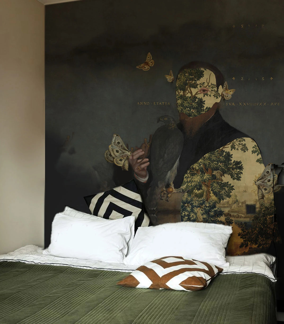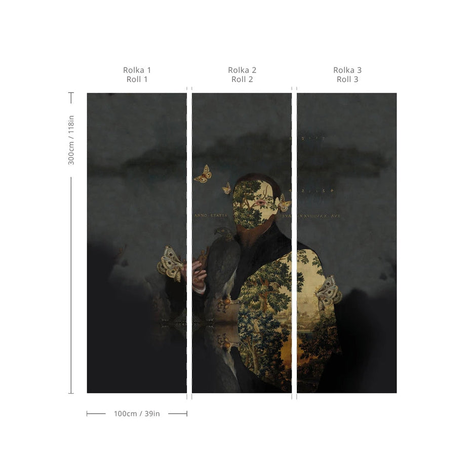 Tapete Gentleman Moth ist eine exzentrische, faszinierende Wanddekoration voller Symbolik, die klassische Porträtmalerei mit surrealistischen Motiven der Motte verbindet. Der markante, künstlerische Charakter des Musters zieht die Blicke an und regt die Fantasie an, wodurch die Tapete zu einem einzigartigen Akzent wird, der dem Raum einen unverwechselbaren Stil und Tiefe verleiht.