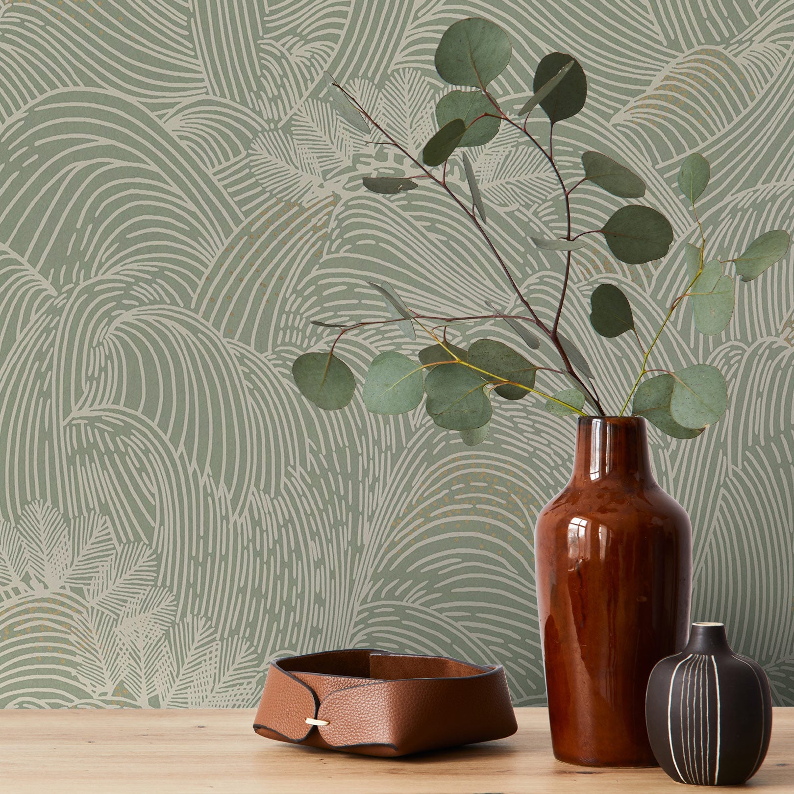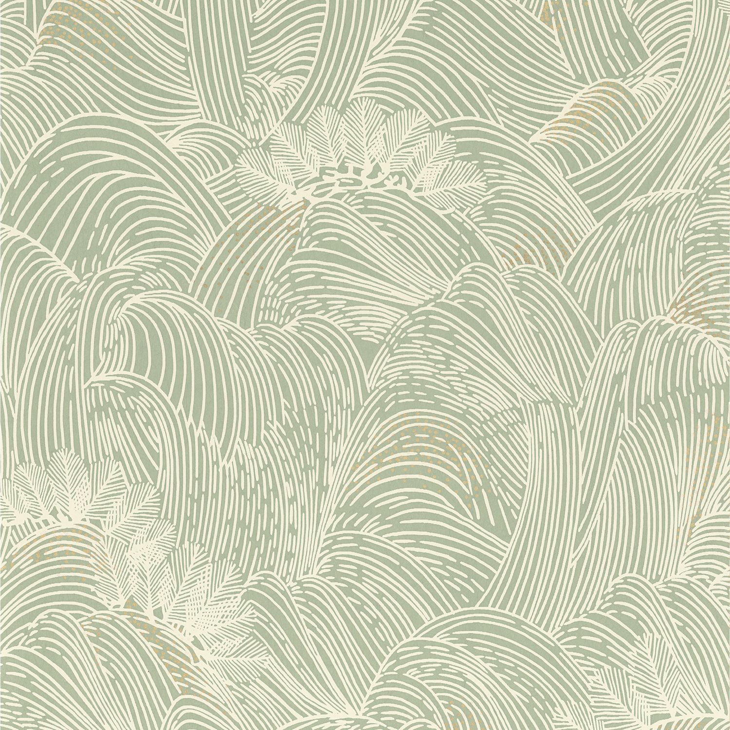 Metallische Tapete mit Eukalyptusblattmotiv CINEREA - VERT grün mit Gold