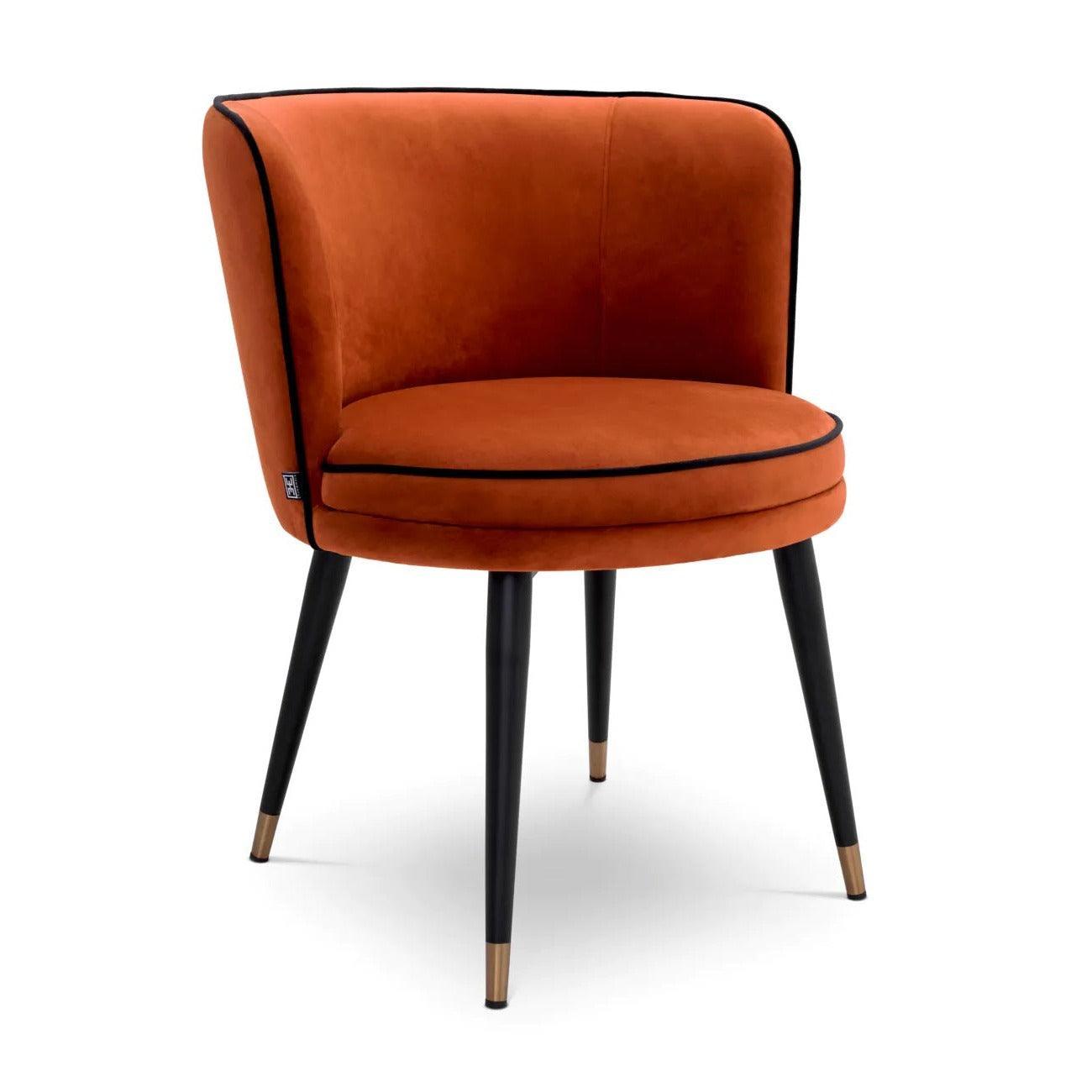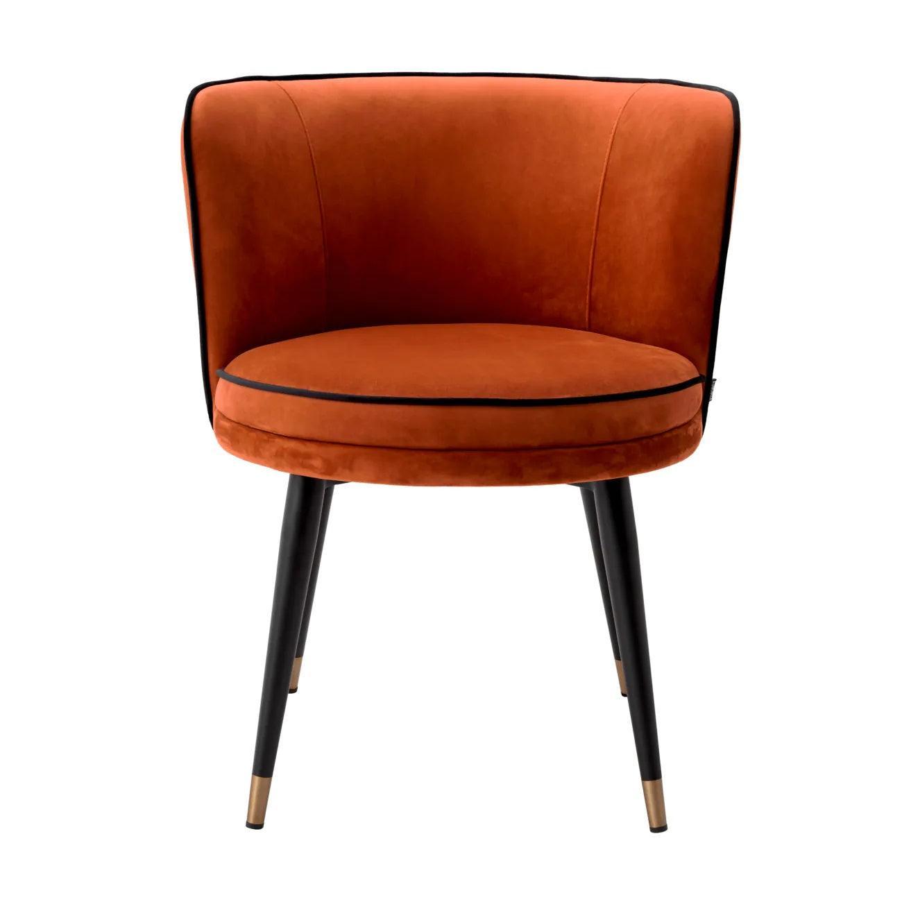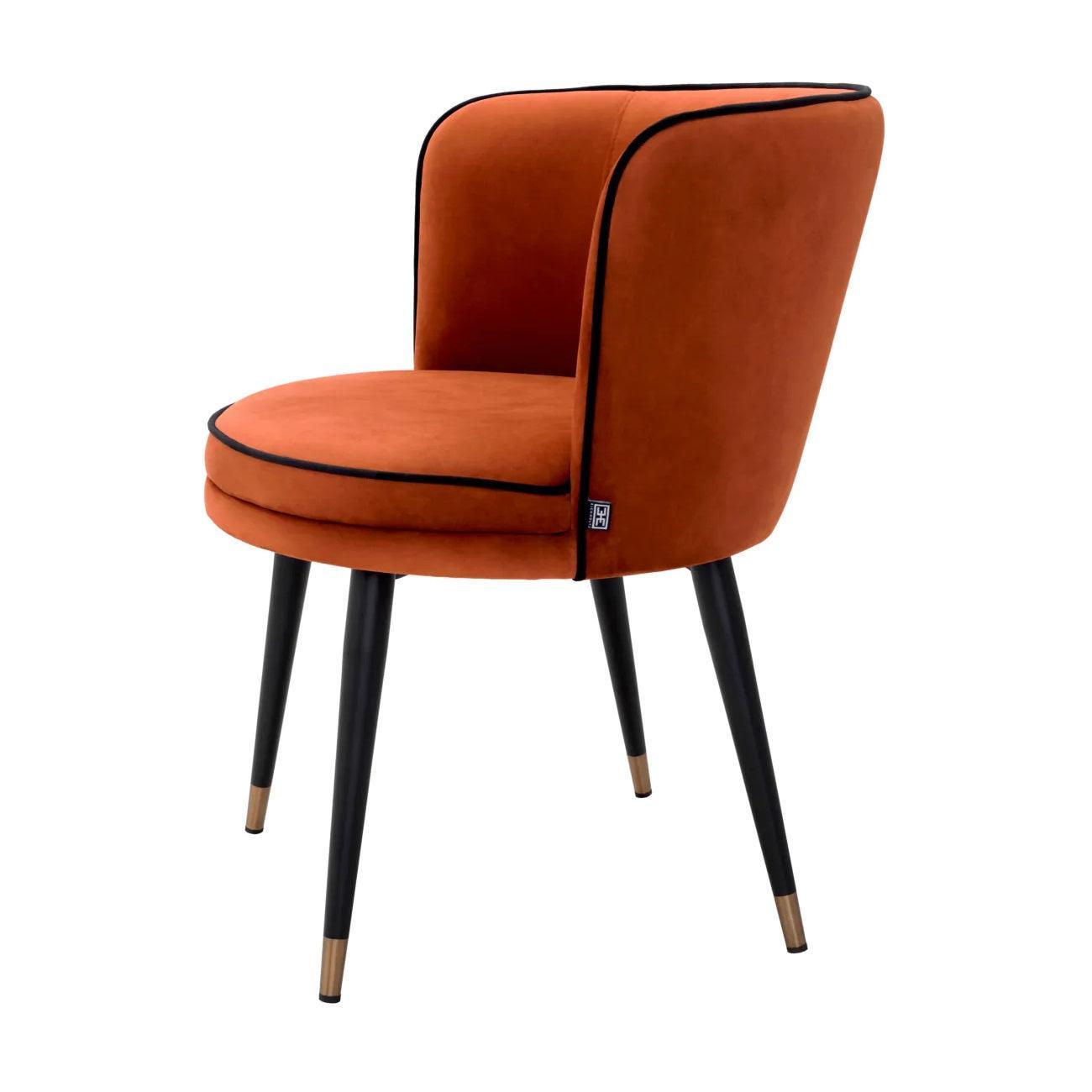Die Sitzfläche des orangefarbenen Stuhls ist mit grauem Savona-Velours bezogen, was nicht nur äußerst angenehm im Griff ist, sondern auch dem gesamten Möbelstück Wärme und Gemütlichkeit verleiht. Die graue Farbe harmoniert perfekt mit dem Schwarz der Beine und schafft einen harmonischen Kontrast.