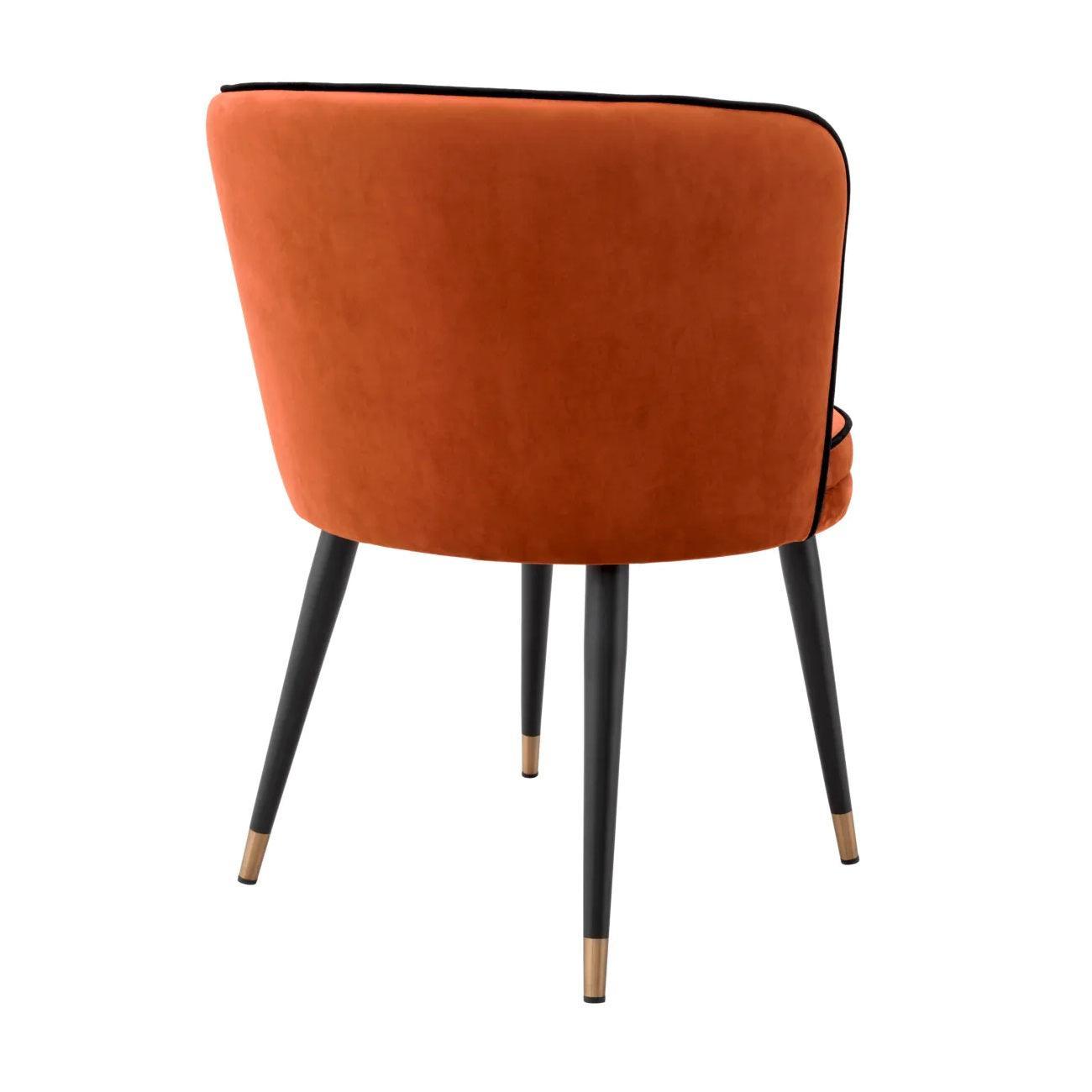 Eines der ersten Elemente, die ins Auge fallen, sind seine schwarzen konischen Beine. Diese subtile Anspielung auf klassisches Design verleiht dem gesamten Stuhl Eleganz. Darüber hinaus sind die Beine mit goldenen Auflagen verziert, die ihnen einen besonderen Glanz und eine luxuriöse Ausführung verleihen. Dieser Stuhl wird mit Sicherheit die Aufmerksamkeit jedes Gastes auf sich ziehen.