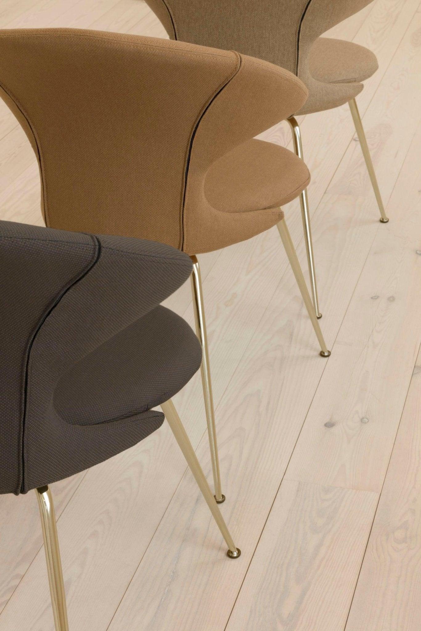Der Stuhl ist in 17 sorgfältig ausgewählten Farben des Stoffes Horizons erhältlich, der zu 100 % aus recyceltem Material besteht oder in 2 Stoffen aus der Teddy-Kollektion. Darüber hinaus umfassen die Optionen für die Beine Messing-, verchromte oder schwarze Oberflächen, was es ermöglicht, den Stuhl an verschiedene Einrichtungsstile anzupassen. Diese Kombination aus Ästhetik, Funktionalität und nachhaltigem Materialansatz macht Time Flies zu einem einzigartigen und langlebigen Angebot.