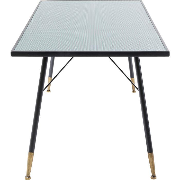 Der Tisch mit Glasplatte und Rahmen in Graphitfarbe, aus Metall gefertigt, ist vielseitig einsetzbar im Wohnzimmer, Esszimmer oder Büro. Der Esstisch sorgt mit seiner gewellten Platte und dem Retro-Design für einen "Wow"-Effekt.