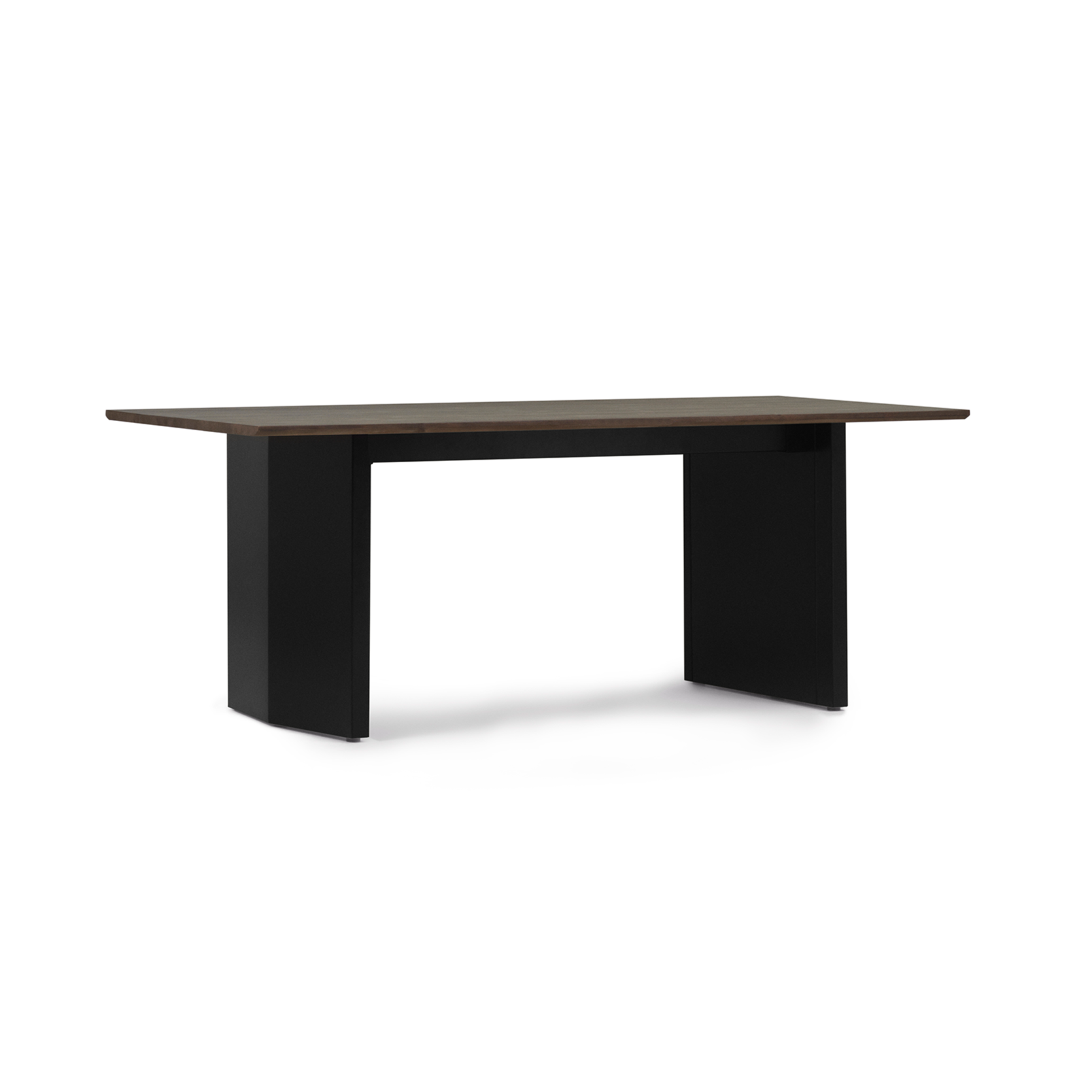 Die Tischplatte besteht aus Kiefernkiefern, bedeckt mit dunkelbraunem Fleck und mattem Schutzlack, der die natürliche Schönheit von Holz betont. Es ruht auf zwei pulvergesteuerten Stahlbasen, die von einem Stahlstrahl für zusätzliche Stabilität verbunden sind. Sowohl die Oberseite als auch die Beine wurden in einem Winkel subtil geschnitten, was dem Ganzen einen eleganten Charakter verleiht. Das Panel ist eine ideale Kombination aus Funktionalität und Ästhetik, die in modernen und klassischen Innenräumen perfekt passt.