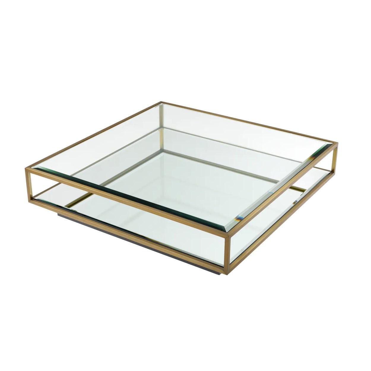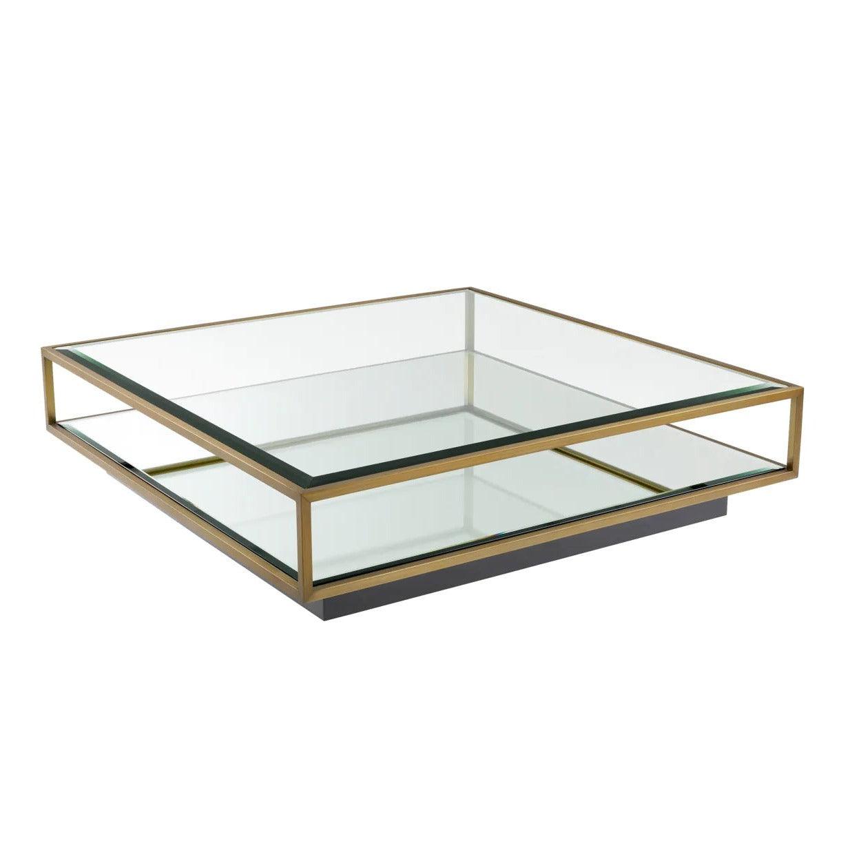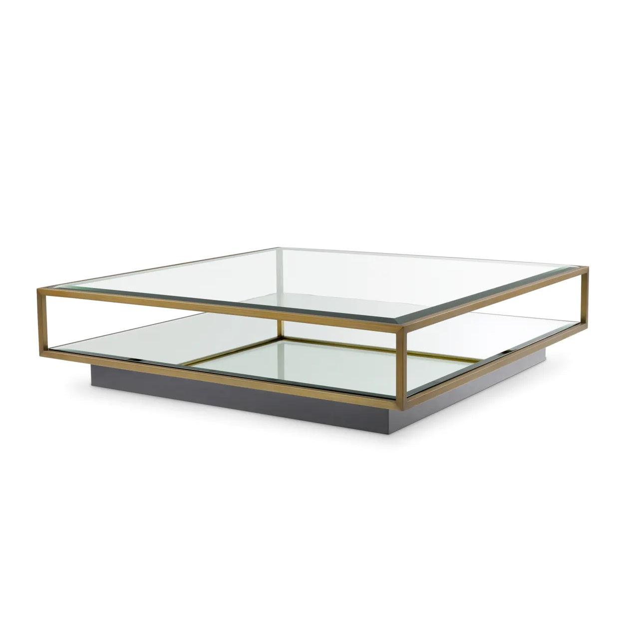 Wenn Couchtisch mehr als nur ein Platz für Kaffee wird – entdecken Sie Tortona, der alle Blicke auf sich zieht und das Herz Ihres Wohnzimmers bildet. Jedes Element aus Messing des Tisches Tortona wurde mit dem Ziel der Exzellenz entworfen. Der elegante Rahmen aus poliertem Edelstahl verleiht ihm nicht nur Stabilität, sondern auch einen außergewöhnlichen Glanz und zeitlose Eleganz. Die Tischplatte aus klarem Glas ist wie eine kristallklare Wasseroberfläche, die das Licht reflektiert und dem Raum eine Weite verleiht. Darüber hinaus ist das untere Regal aus facettiertem Spiegelglas nicht nur ein funktionaler Stauraum, sondern auch ein Element, das einen luxuriösen Reflexionseffekt einbringt.
