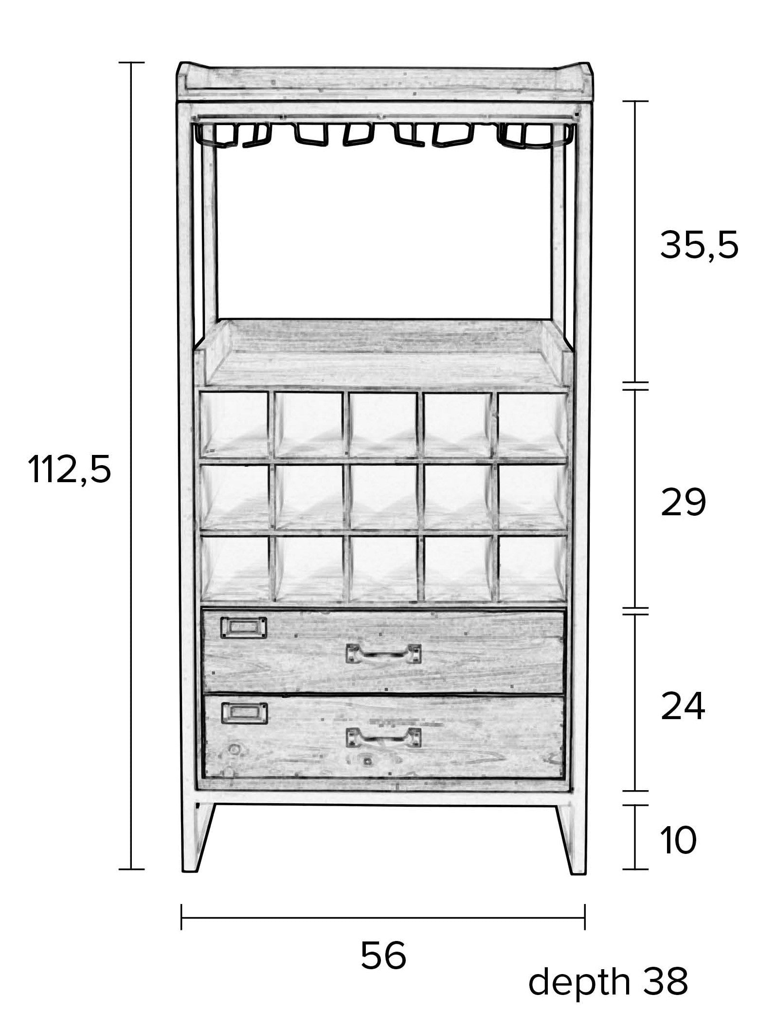 Schublade mit Schulter Edgar ist ein elegantes Möbelstück, ideal für ein Wohnzimmer oder Büro, das im amerikanischen Stil eingerichtet ist. Es ist auch eine großartige Lösung für ein elegantes Restaurant, in dem Sie hochwertige Getränke servieren können. Die Stange hat einen Rahmen aus pulverem gestrichenem Stahl bis grau und harmoniert mit Holzelementen. Der obere Teil der Schulter- und Schubladenfronten besteht aus Tannenholz in natürlicher Farbe und der Innenraum von MDF -Schubladen. Oben befindet sich ein Holzoberteil mit vier Gläserreihen für Gläser, und unter der Oberseite befinden sich drei Flaschenreihen für Flaschen, fünf in jeder Reihe und zwei breite Schubladen. Kommode Mit der Schulter ist Edgar nicht nur ein funktionaler, sondern auch ein entzückendes Element der Ausrüstung, das jeden Gast verzaubert.