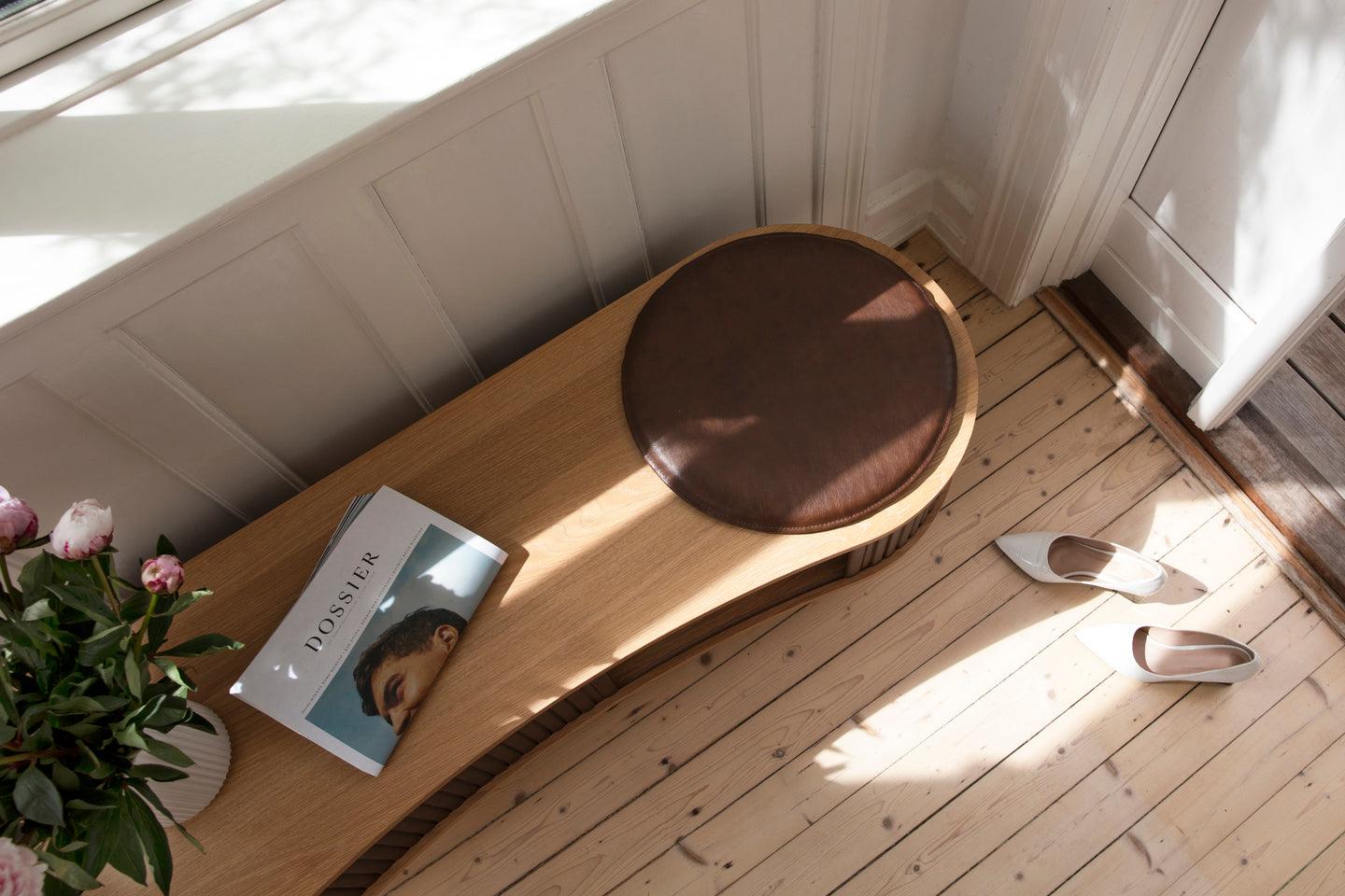 Solid Eiche, Eichenfurnier, Polyester, MDF, Stahl, künstliches Leder (Kissen)