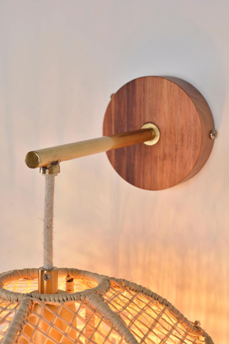 Diese Wandlampe beleuchtet nicht nur den Raum, sondern hat auch eine praktische Funktion als Ort zum Aufhängen von Kleidung. Die Kombination aus handgespüteren Rafia mit Holz- und Messingelementen schafft ein elegantes und natürliches Aussehen und verleiht dem Innenraum Charakter. Dies ist nicht nur Beleuchtung, sondern auch ein dekoratives Element, das dem Raum einen subtilen ethnischen Charme und die Funktionalität verleiht.