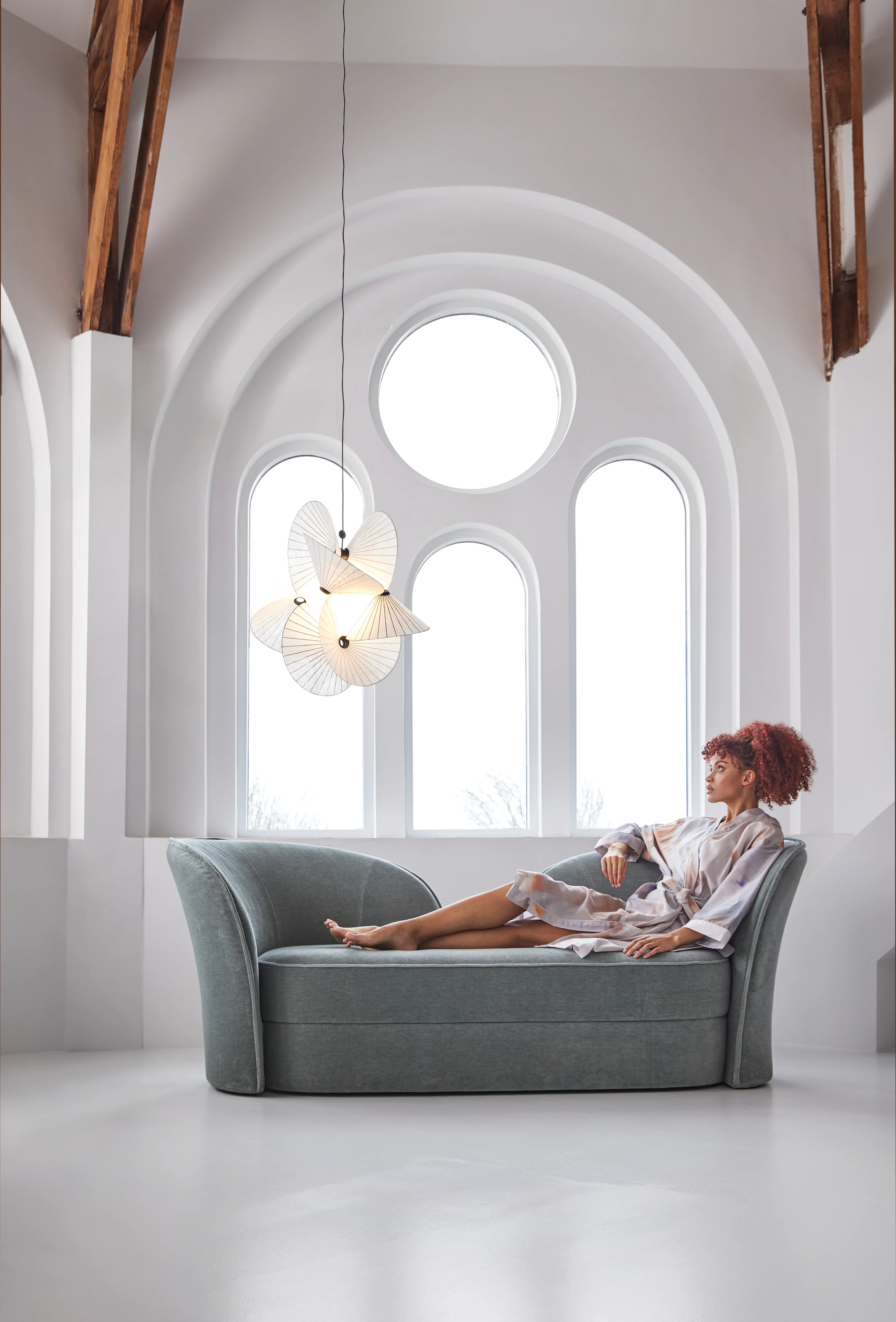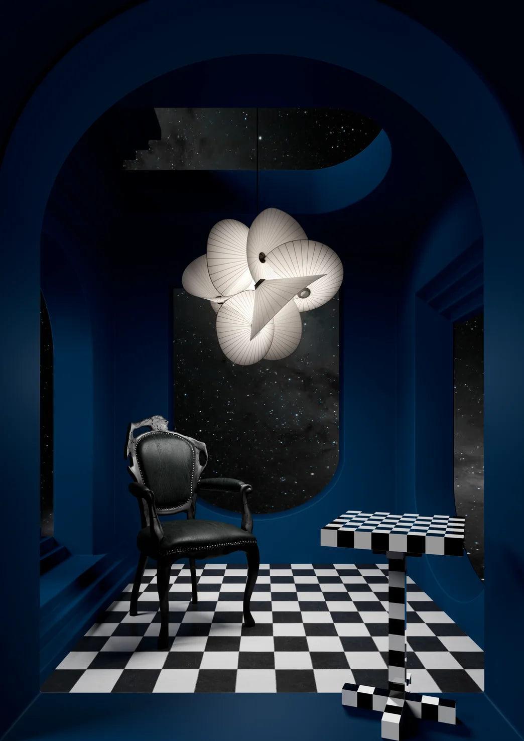 Serpentinenlicht zu Luftige Hanglampe Erstellt mit hoch entwickelten Wendungen und Wendungen. Das Beleuchtungsdesign wurde durch das Drehen und Drehen eines Blattes Papier erzeugt. Mit Spannung und natürlichen Fluss spielen und die Grenzen verschiedener Formen entdecken, die Papier annehmen können.