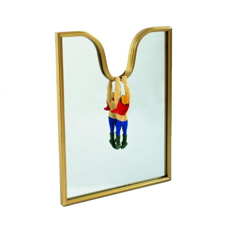 Spiegel Zirkus in einem goldenen Rahmen ist eine faszinierende Kombination aus Illusion und Spaß, die vom Zirkus inspiriert ist. Auf den ersten Blick scheint es, dass der Charakter aus dem Zirkus auf der Oberfläche des Spiegels gleitet und seine Oberfläche auflöst. Das einzigartiger Spiegel Es kombiniert Magie und optische Kunst.