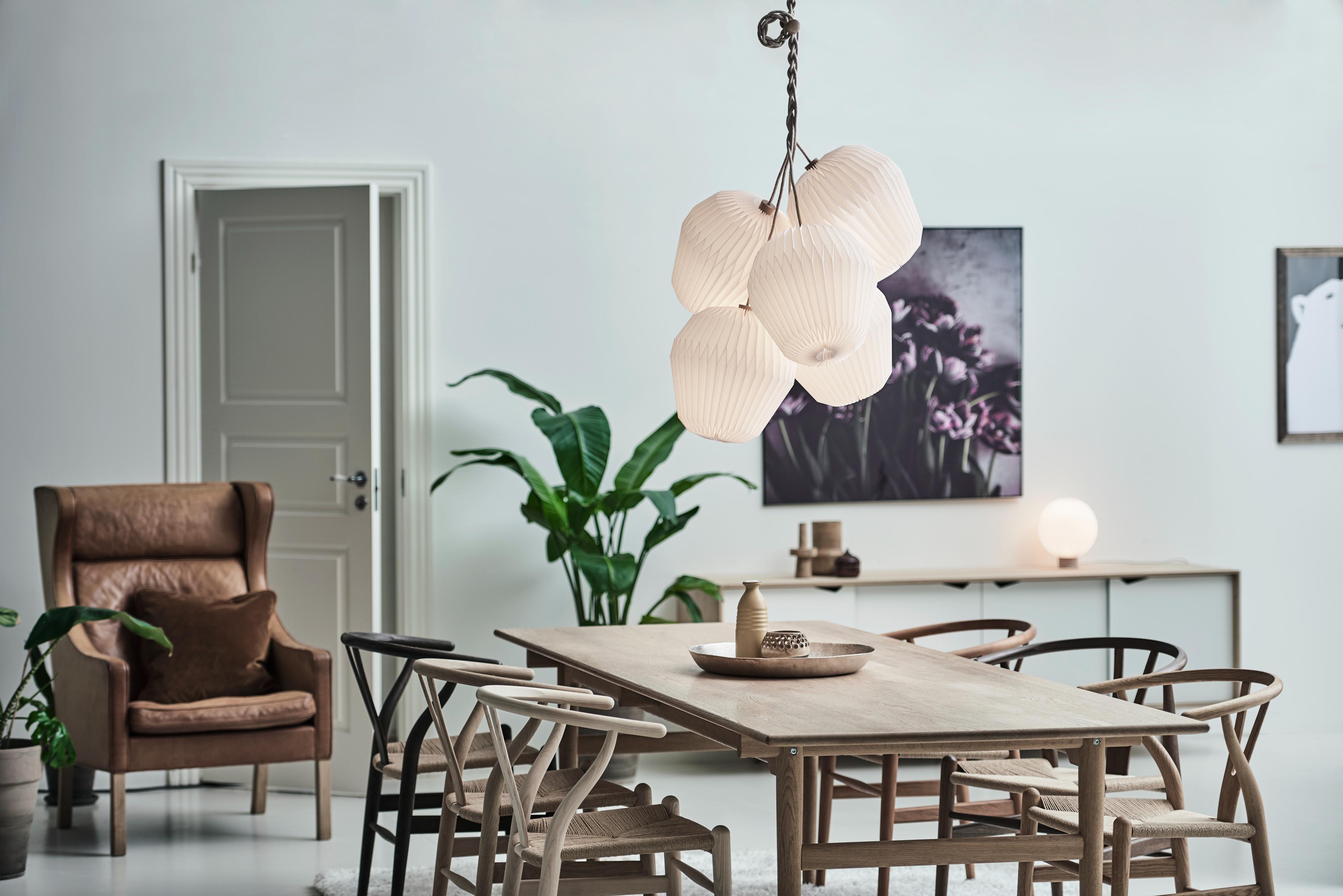 Jeder Kronleuchter Bouquet 5 wird mit Liebe zum Detail gefertigt. Die handgefertigten Schirme aus Papier oder Standardfolie garantieren ein weiches, diffuses Licht, das eine besondere Atmosphäre in jedem Raum schafft. Eichelemente und ein Leinenkabel verleihen dem Ganzen einen natürlichen Charme. Dieser Deckenleuchter ist in verschiedenen Größen erhältlich, was es ermöglicht, ihn an die Größe des Raumes anzupassen und dabei Stil und Funktionalität zu bewahren.